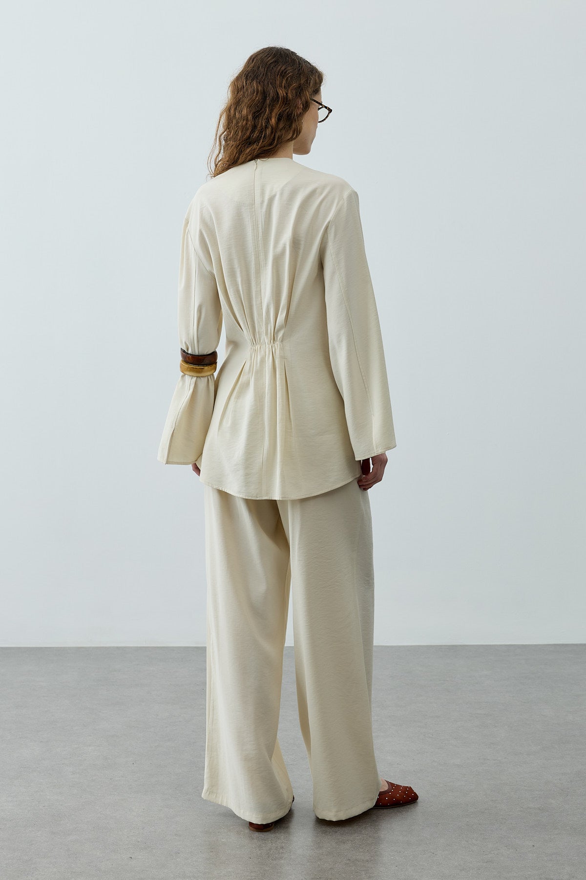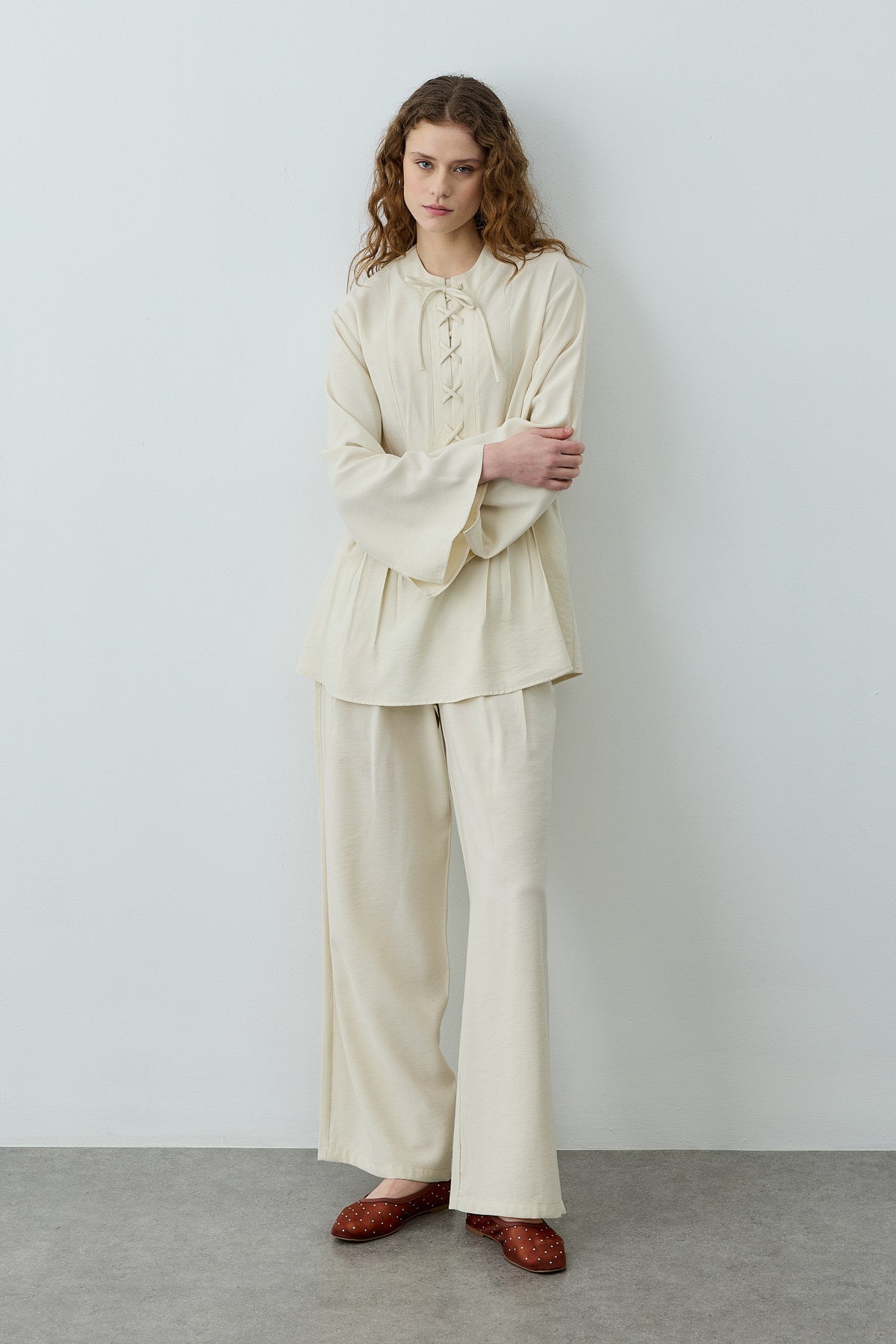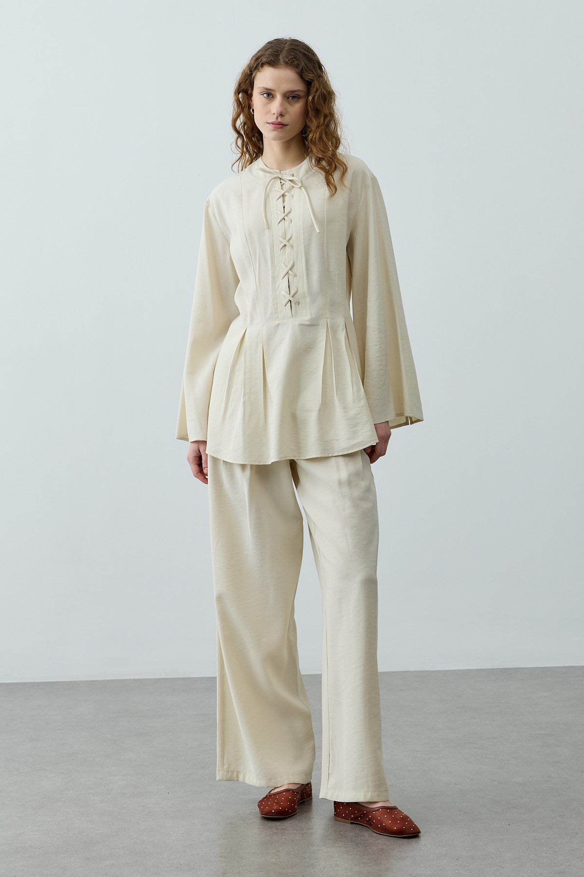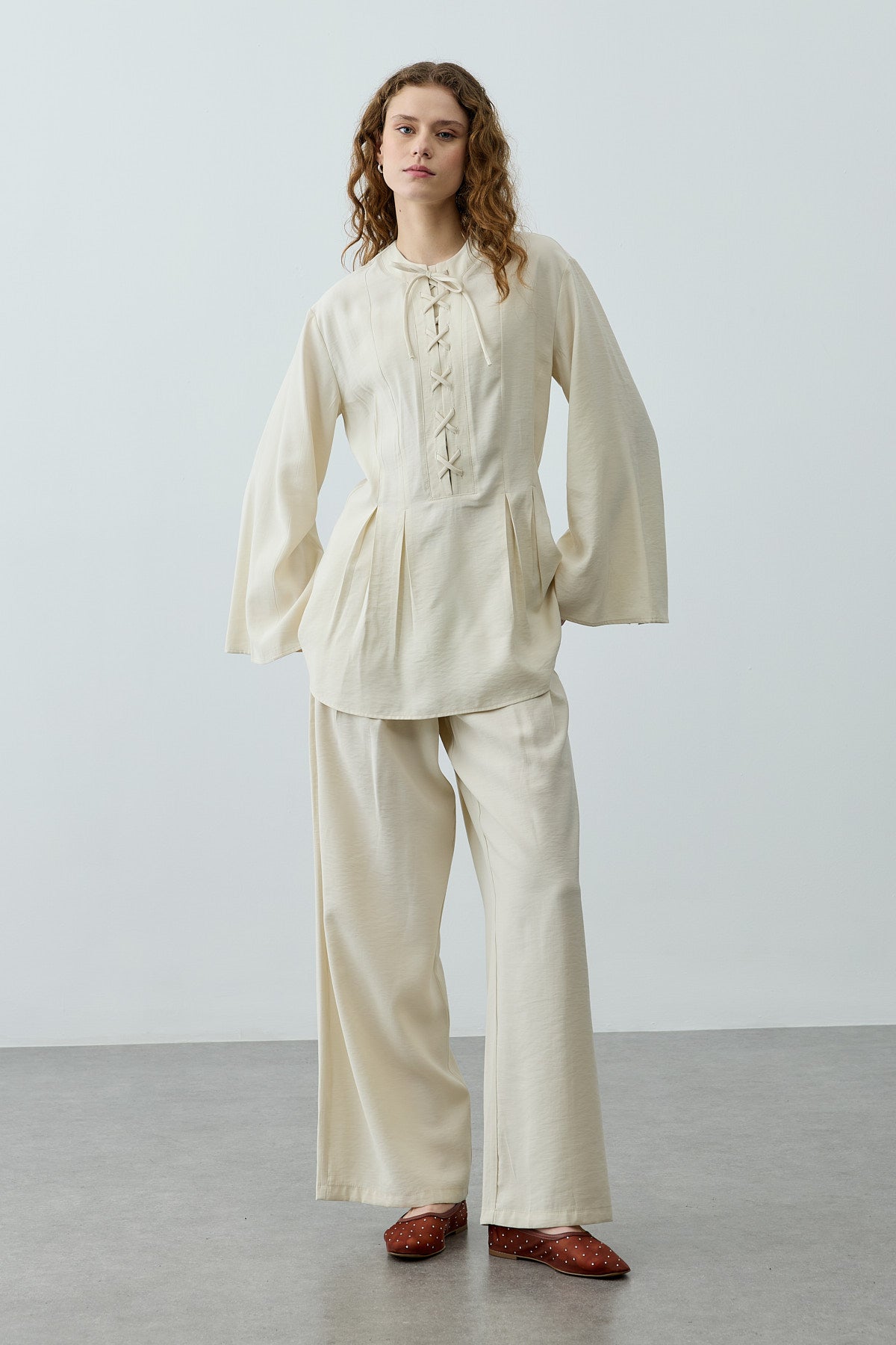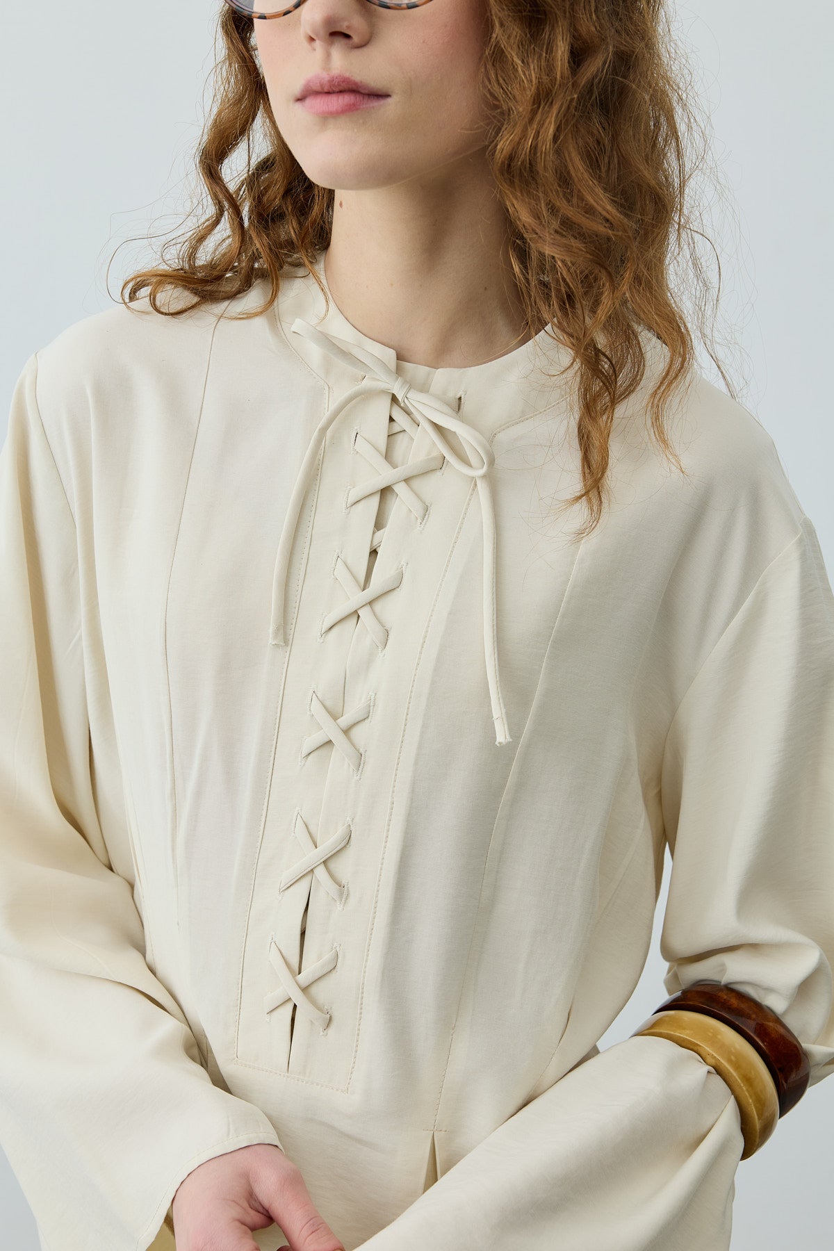 Tensel dokuma kumaştan, önü bağcıklı , uzun geniş kollu gömlek.