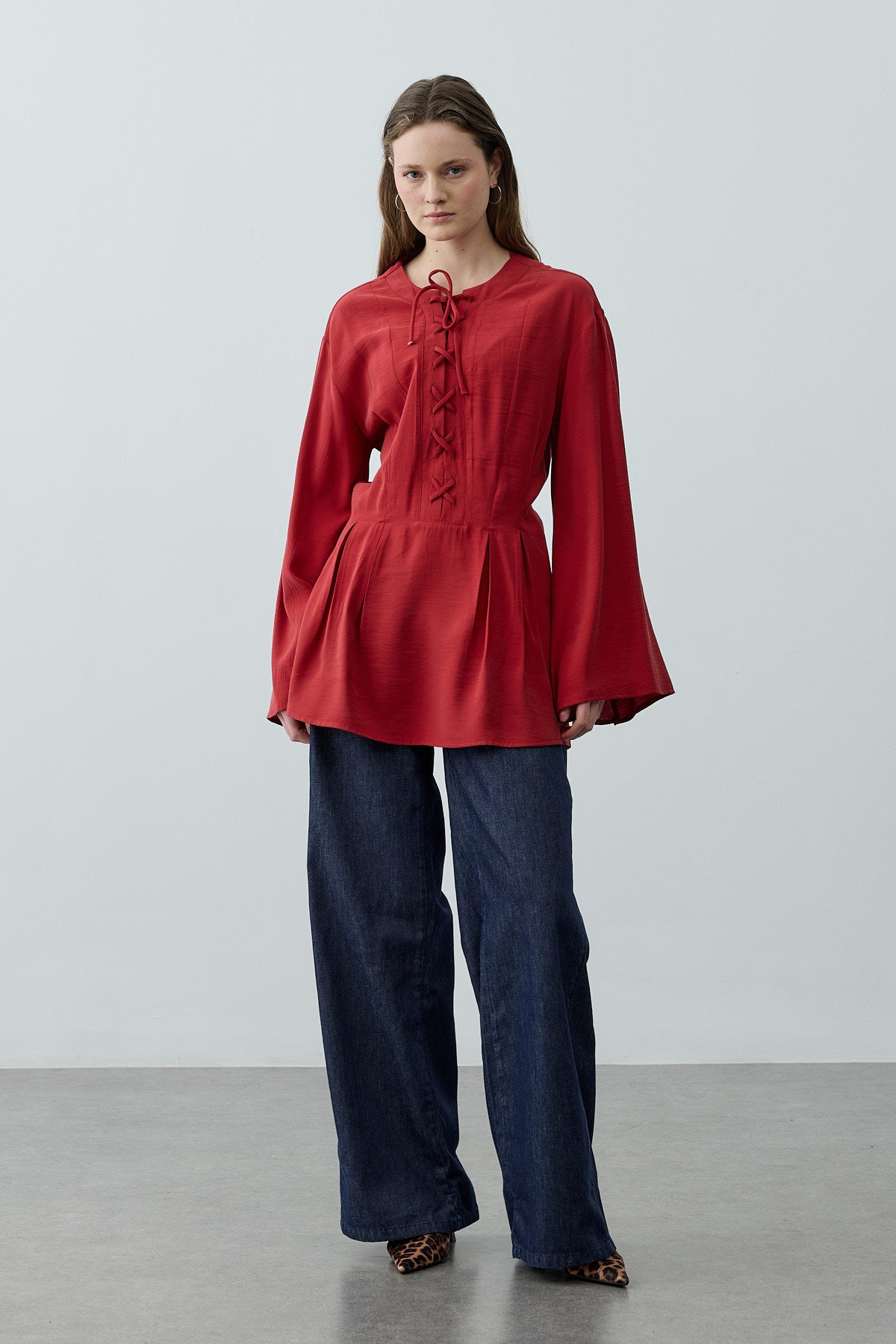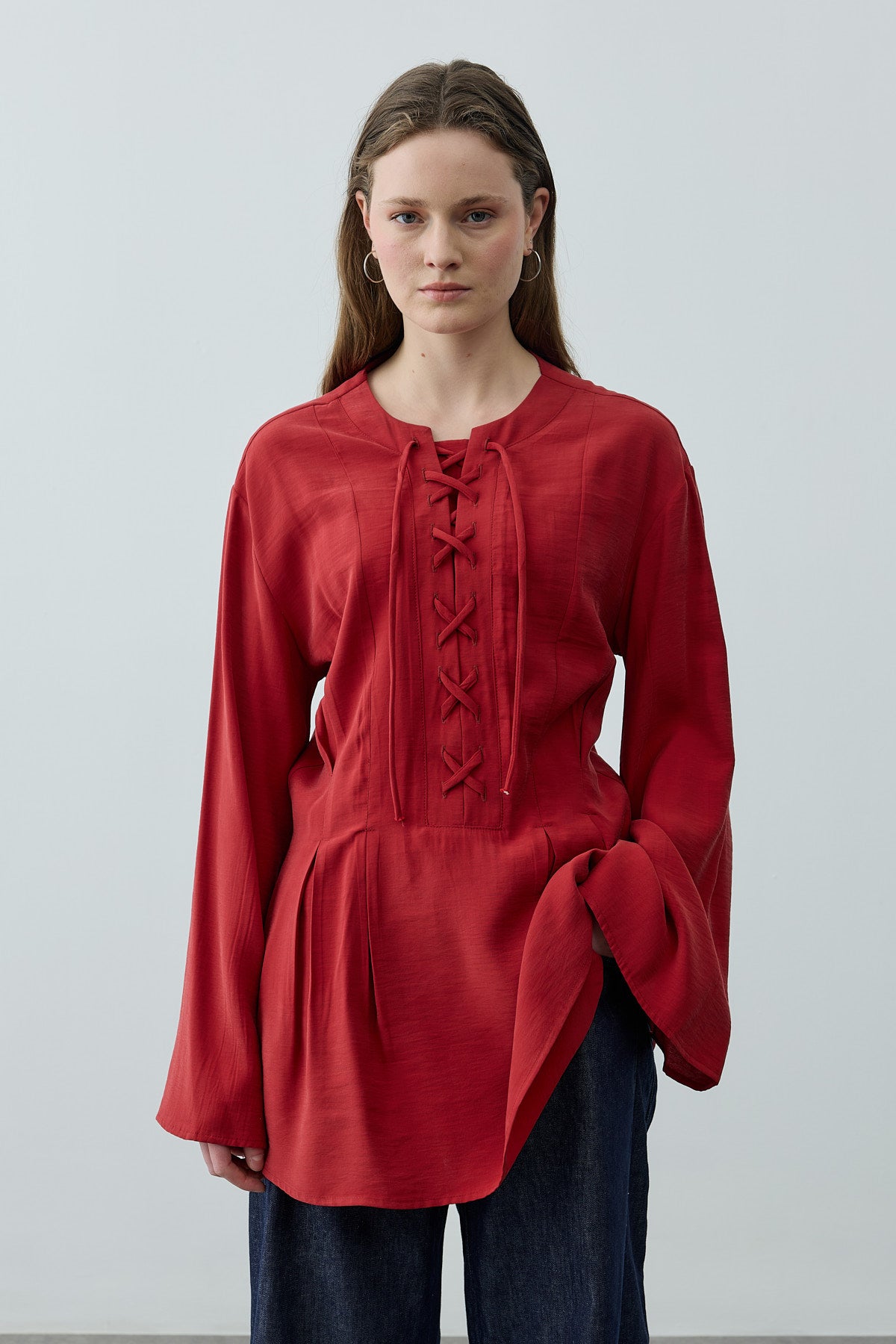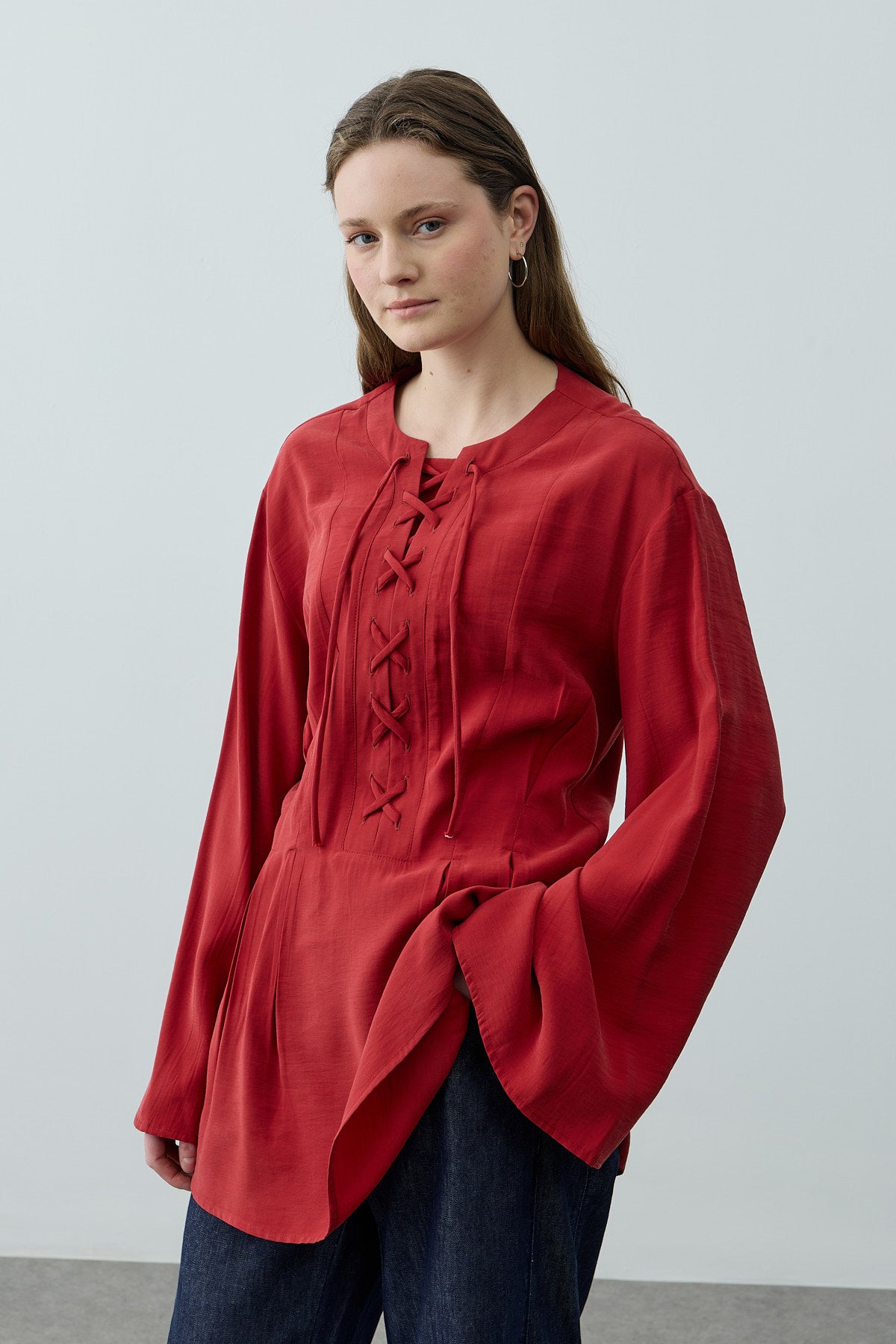 Tensel dokuma kumaştan, önü bağcıklı , uzun geniş kollu gömlek.