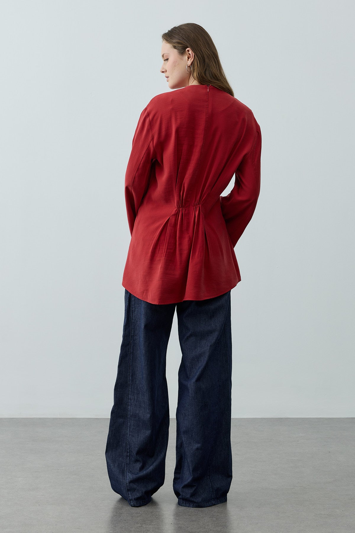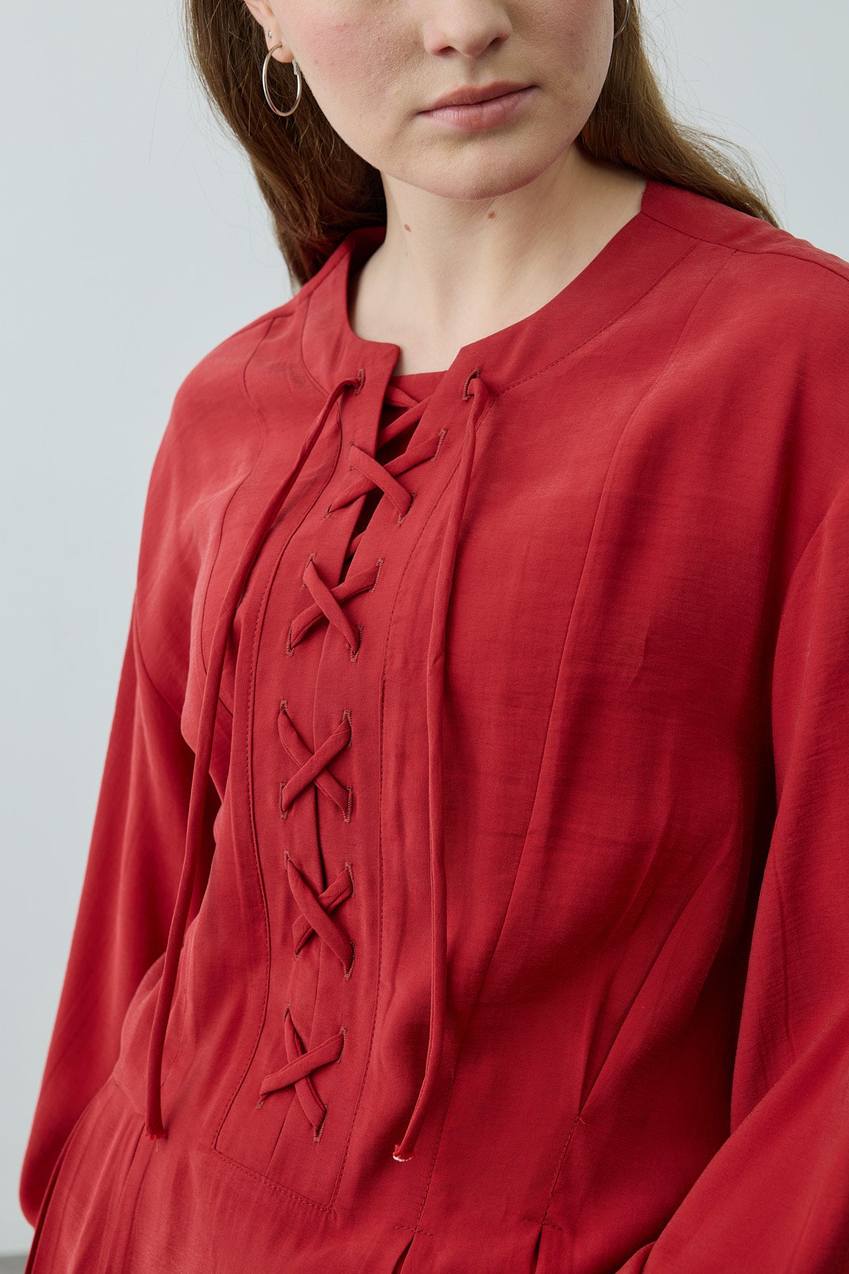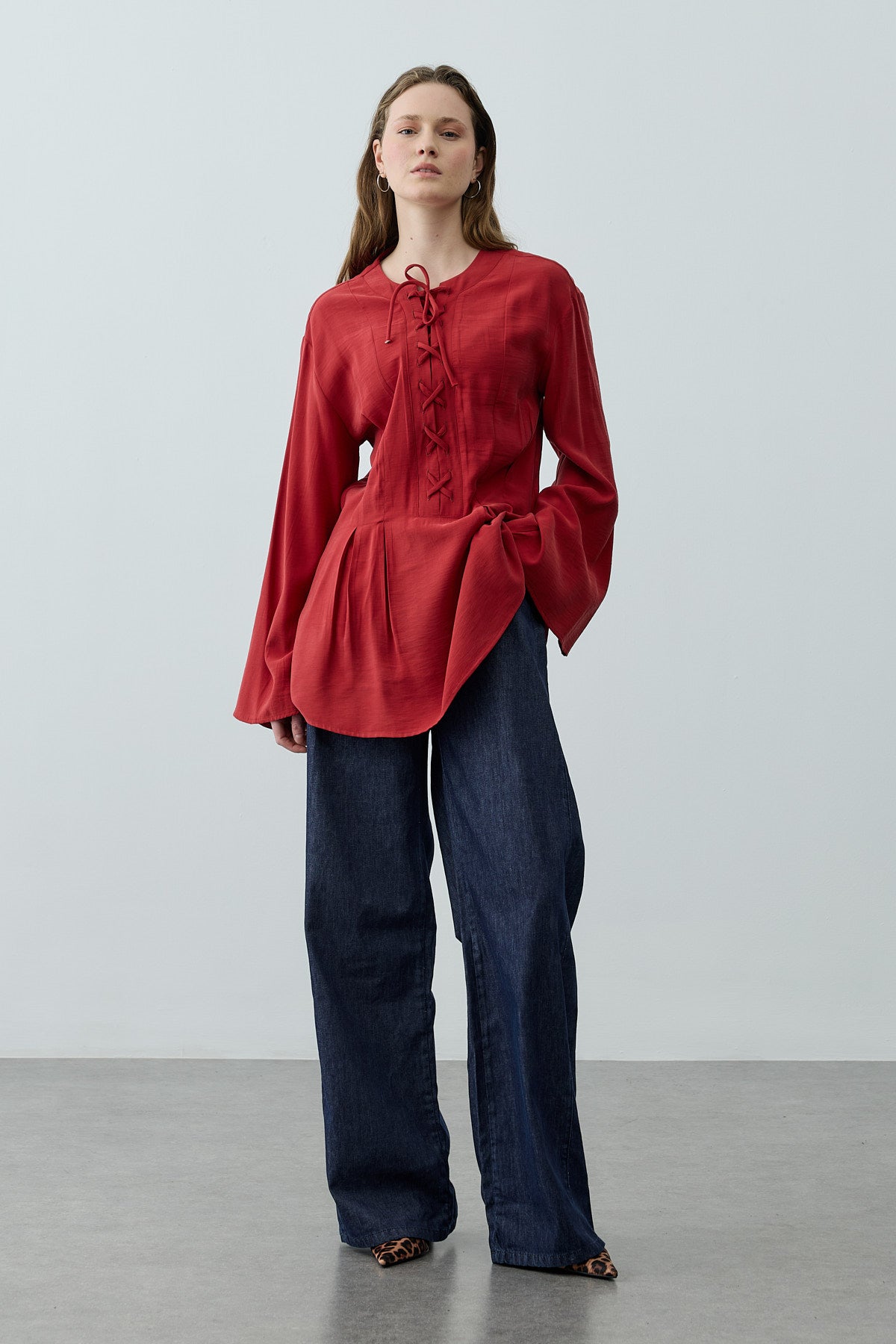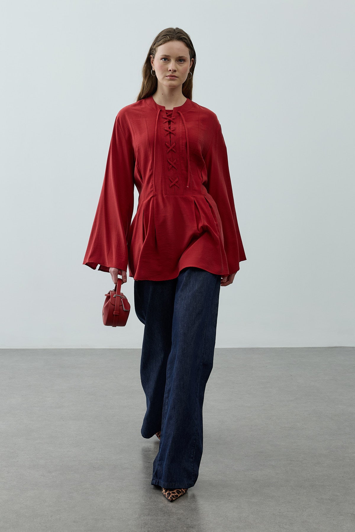 Tensel dokuma kumaştan, önü bağcıklı , uzun geniş kollu gömlek.