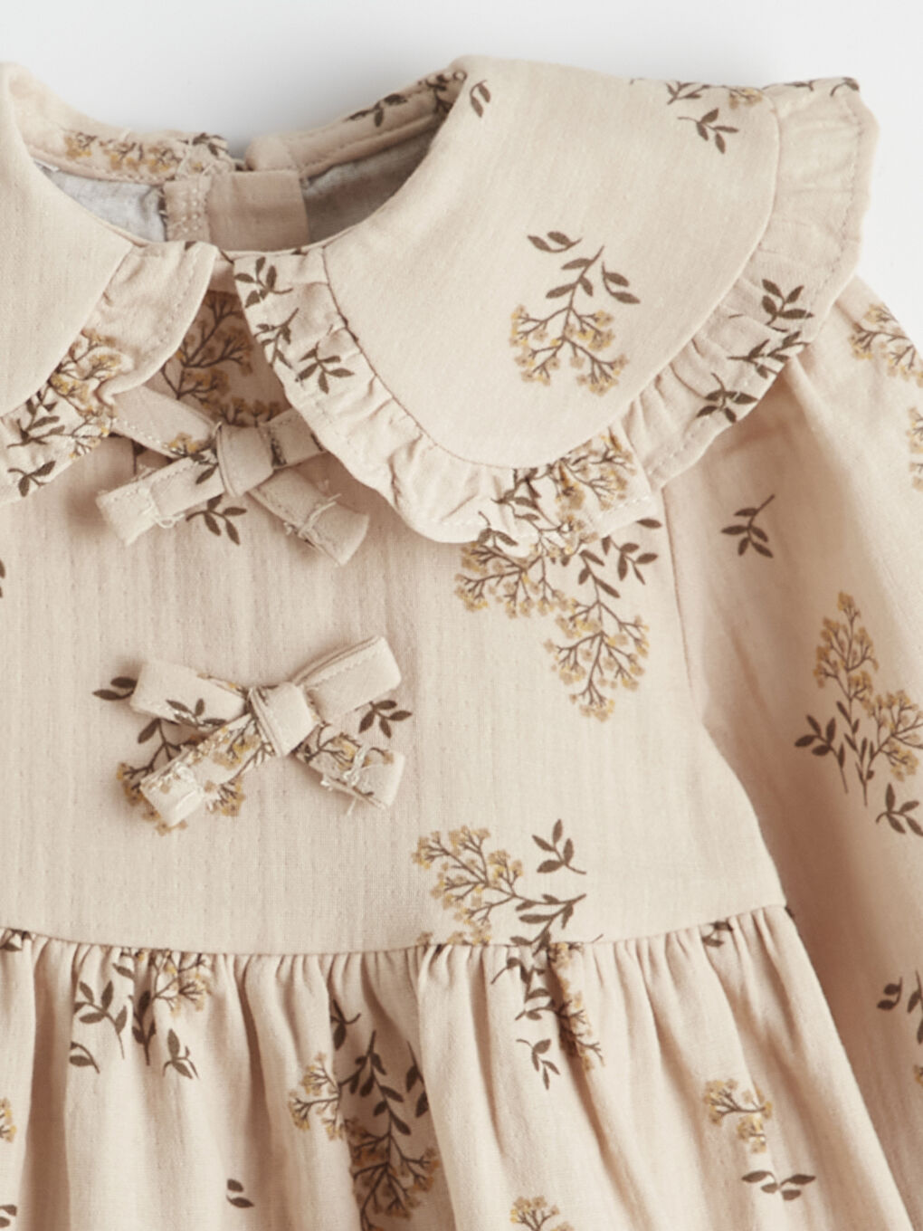 Bej Bebe Yaka Çiçekli Kız Bebek Müslin Elbise