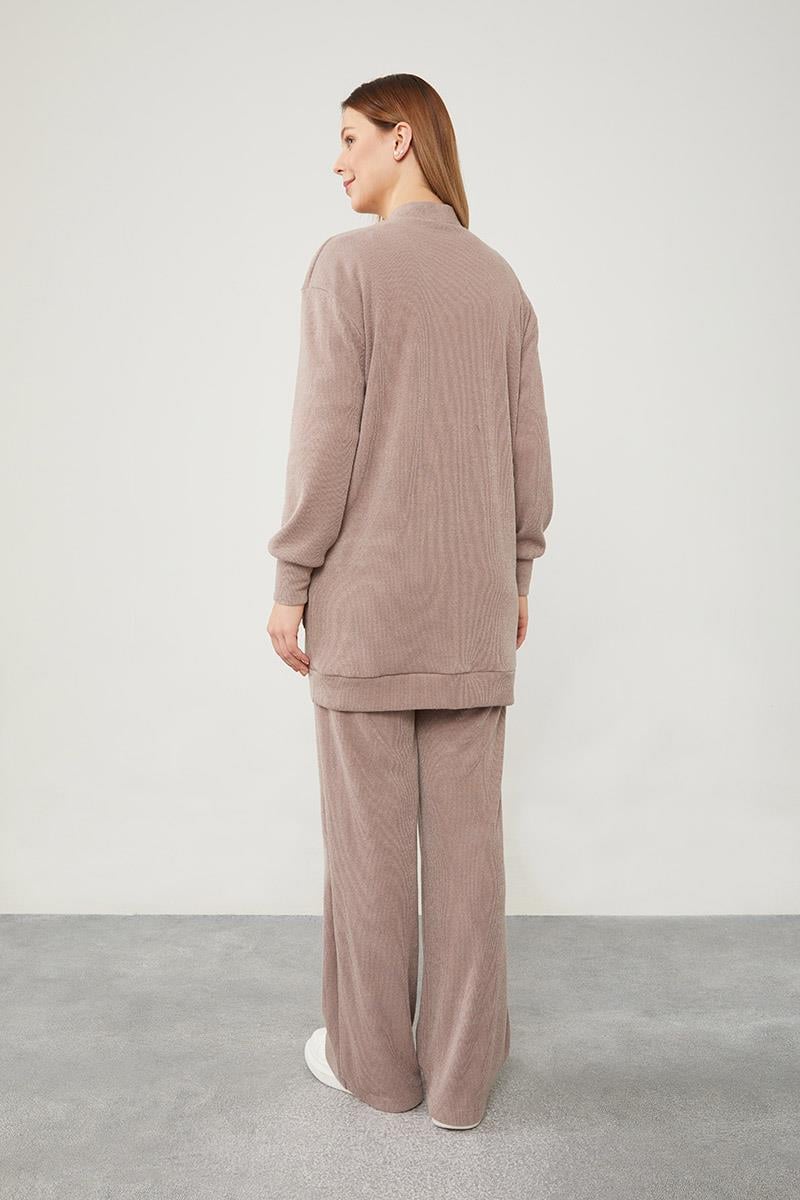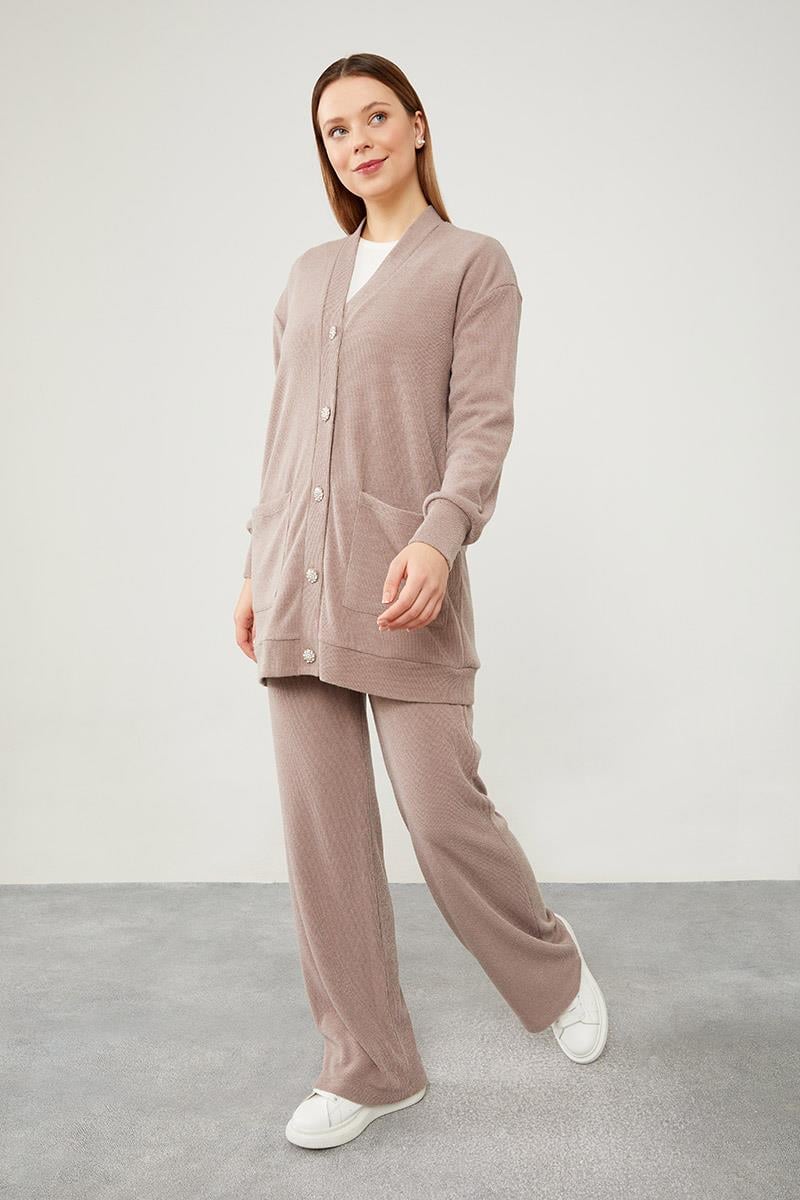 Bej Desenli Hırkalı Triko Takım
