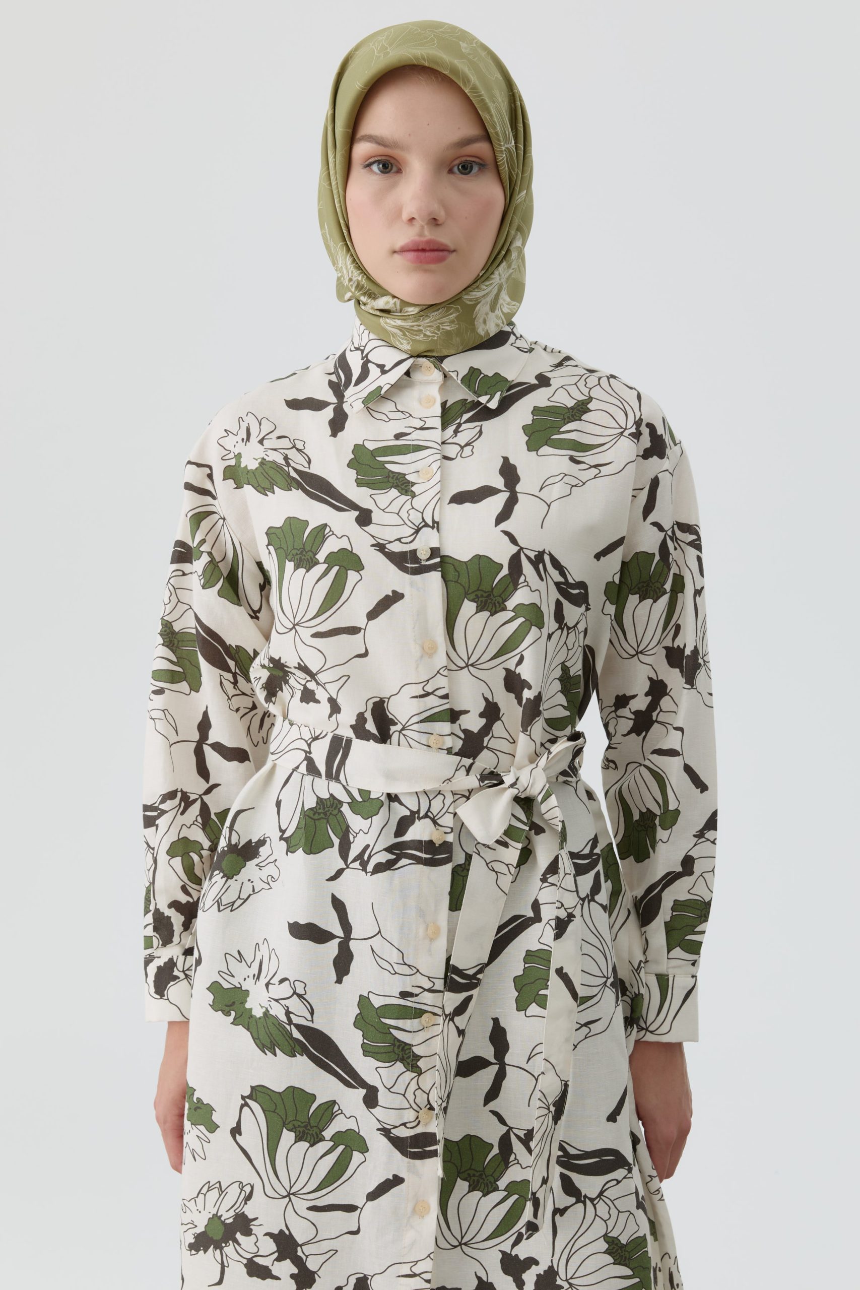 Bu tunik, yumuşak tonlardaki çiçek desenleri ile romantik bir hava sunarken, çıkarılabilir kuşak detayı vücut şeklini zarif bir şekilde vurgular.
