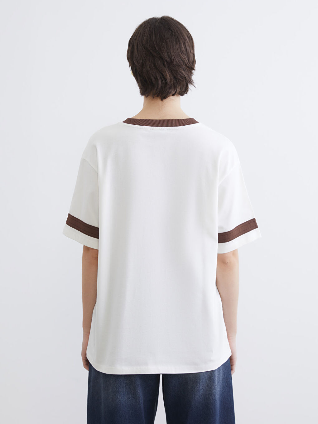 Bej V Yaka Los Angeles Baskılı Oversize Kadın Tişört