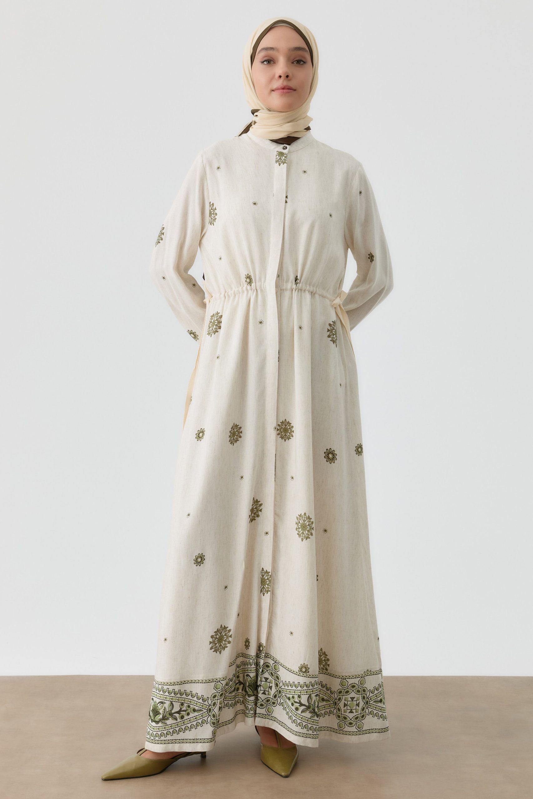 Çiçek desenleriyle romantik bir hava kazanan bu elbise, belden büzgü bağlaması sayesinde siluetinizi zarifçe vurgular. Hafif ve akıcı kumaşı, gün boyu konfor sunarken, hareketli etek detayı her adımda feminen bir dinamizm yaratır.