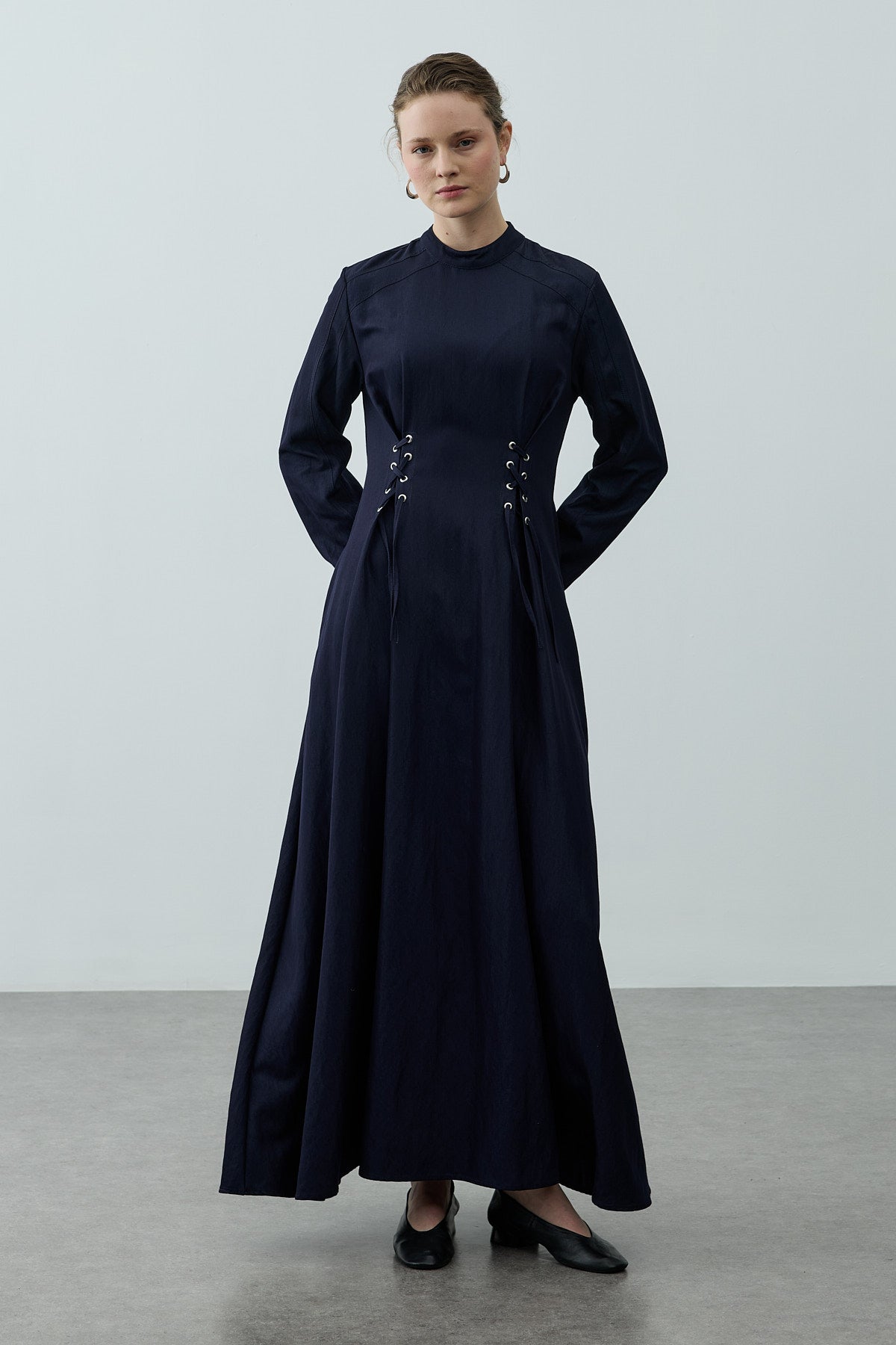 Dokulu dokuma kumaştan, bisiklet yakalı, sırtı fermuar kapamalı, beli kuşgözü detaylı, uzun kollu, manşetli, maxi boy elbise.