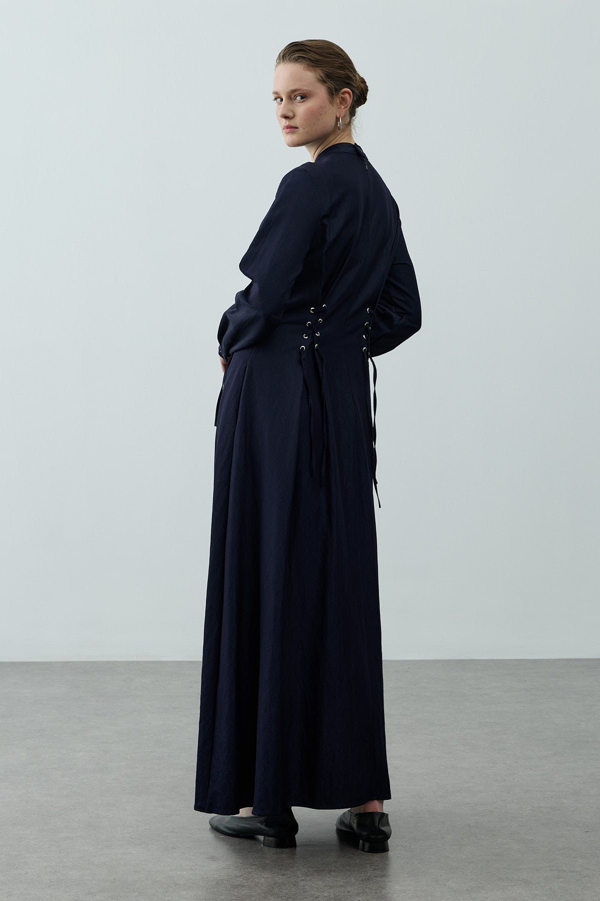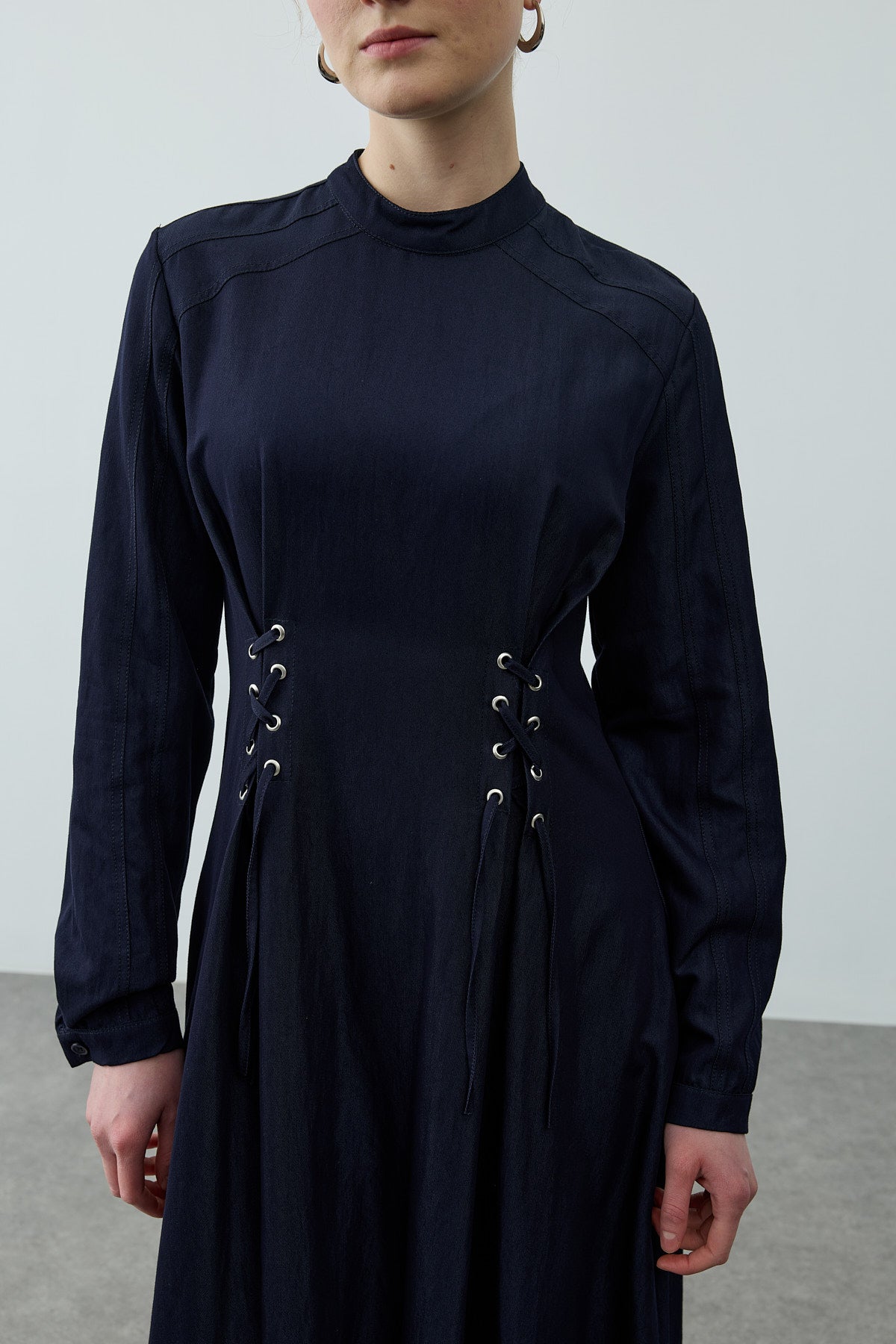 Beli Kuşgözlü Bağlamalı Elbise Lacivert
