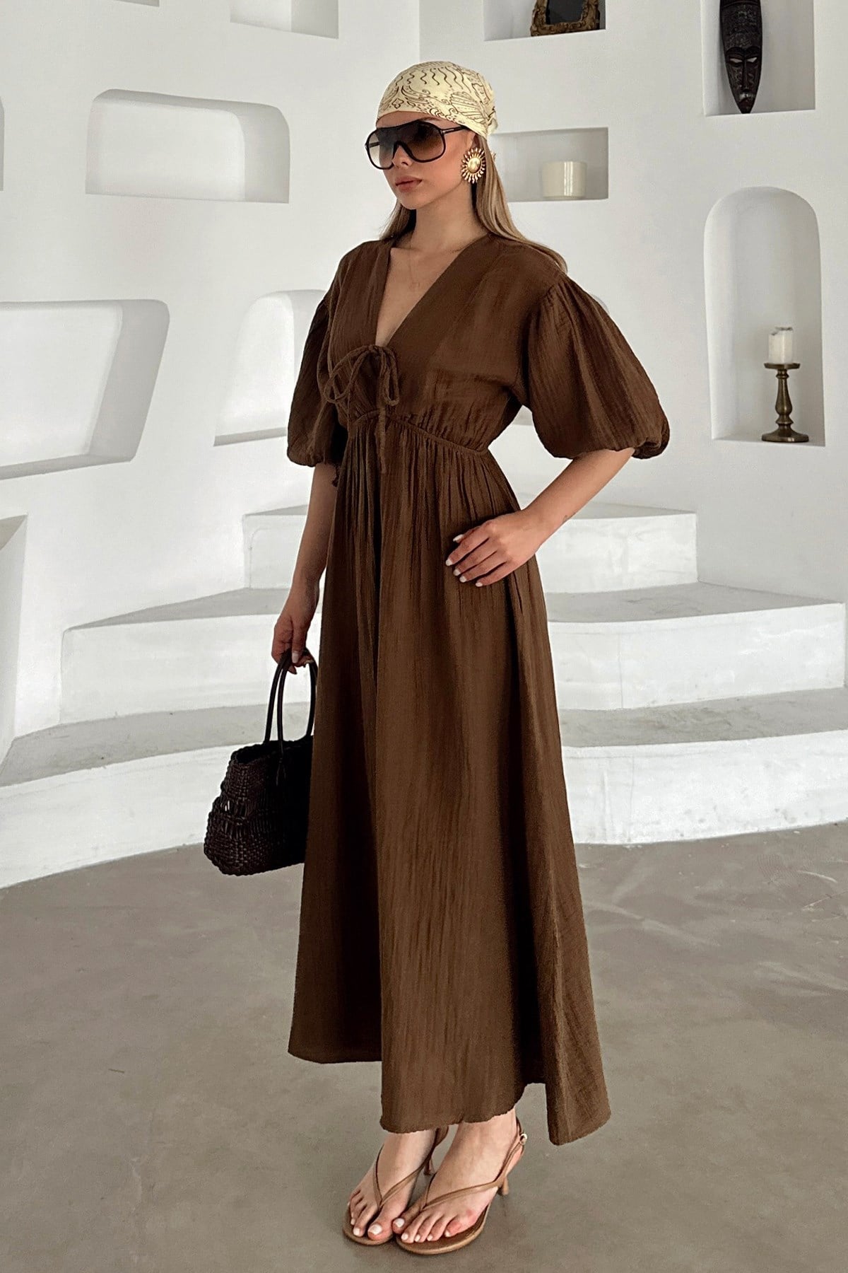 Kahve renkli müslin elbise, doğal tonları sevenler için ideal bir seçimdir. Rahat kesimi sayesinde gün boyu konfor sağlar. Günlük ve yazlık kombinlerde rahatlıkla tercih edilebilir.