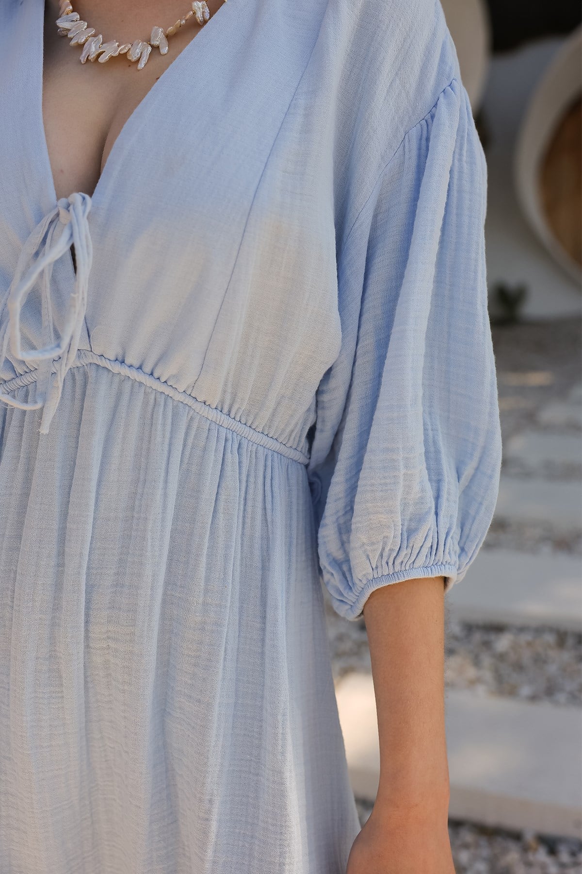 Beli Lastikli Bağcık Detaylı Yarım Kol Müslin Elbise MAVİ 9331-E
