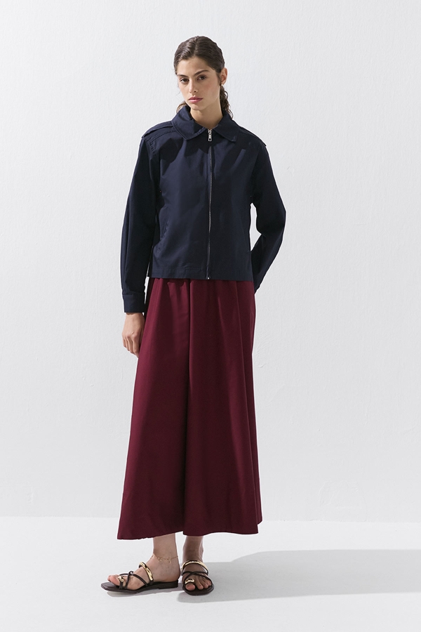 Pile detaylı, arkadan gizli fermuarlı, su itici kumaşa sahip, rahat, kloş kesim etek.