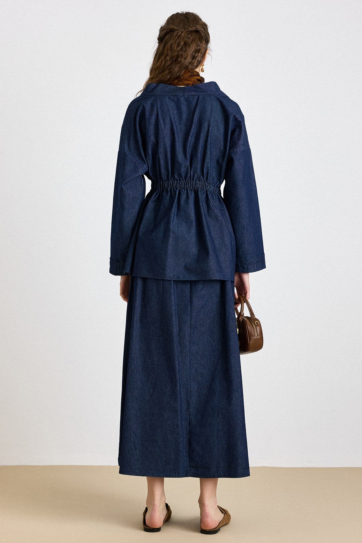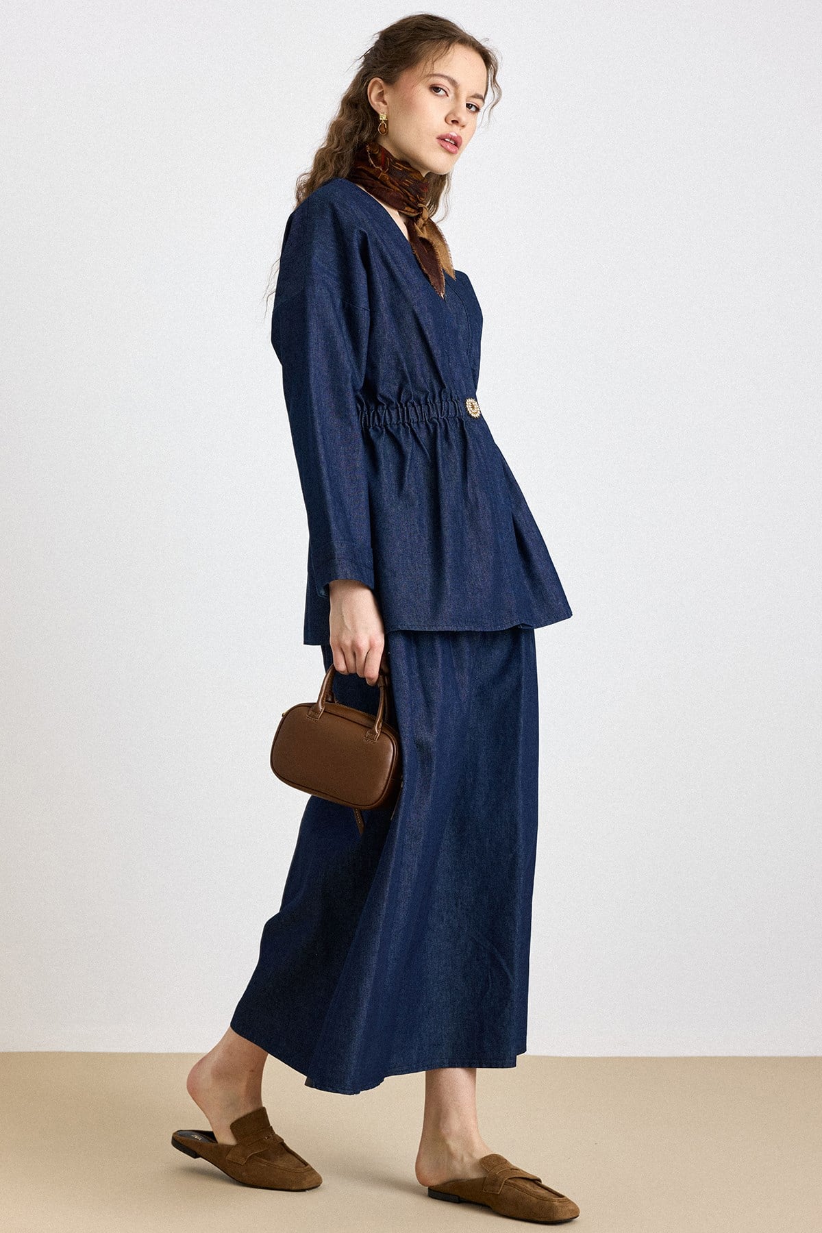 Tunik ve pantolonun uyumlu siluetiyle öne çıkan bu takım, aplike cep detaylarıyla sade tasarıma sofistike bir karakter kazandırır. Akıcı kumaşı gün boyu konfor sağlarken, modern çizgisi şehir stiline güçlü ama yalın bir dokunuş ekler.