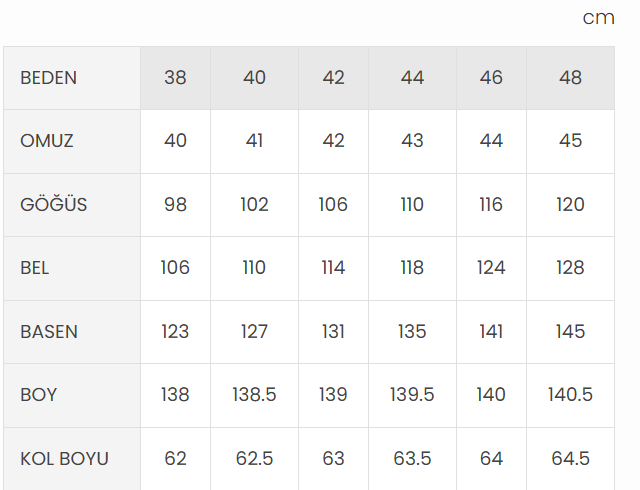 Manken Ölçüleri: Boy: 174 cm, Göğüs: 85 cm, Bel: 59 cm, Basen: 90 cm