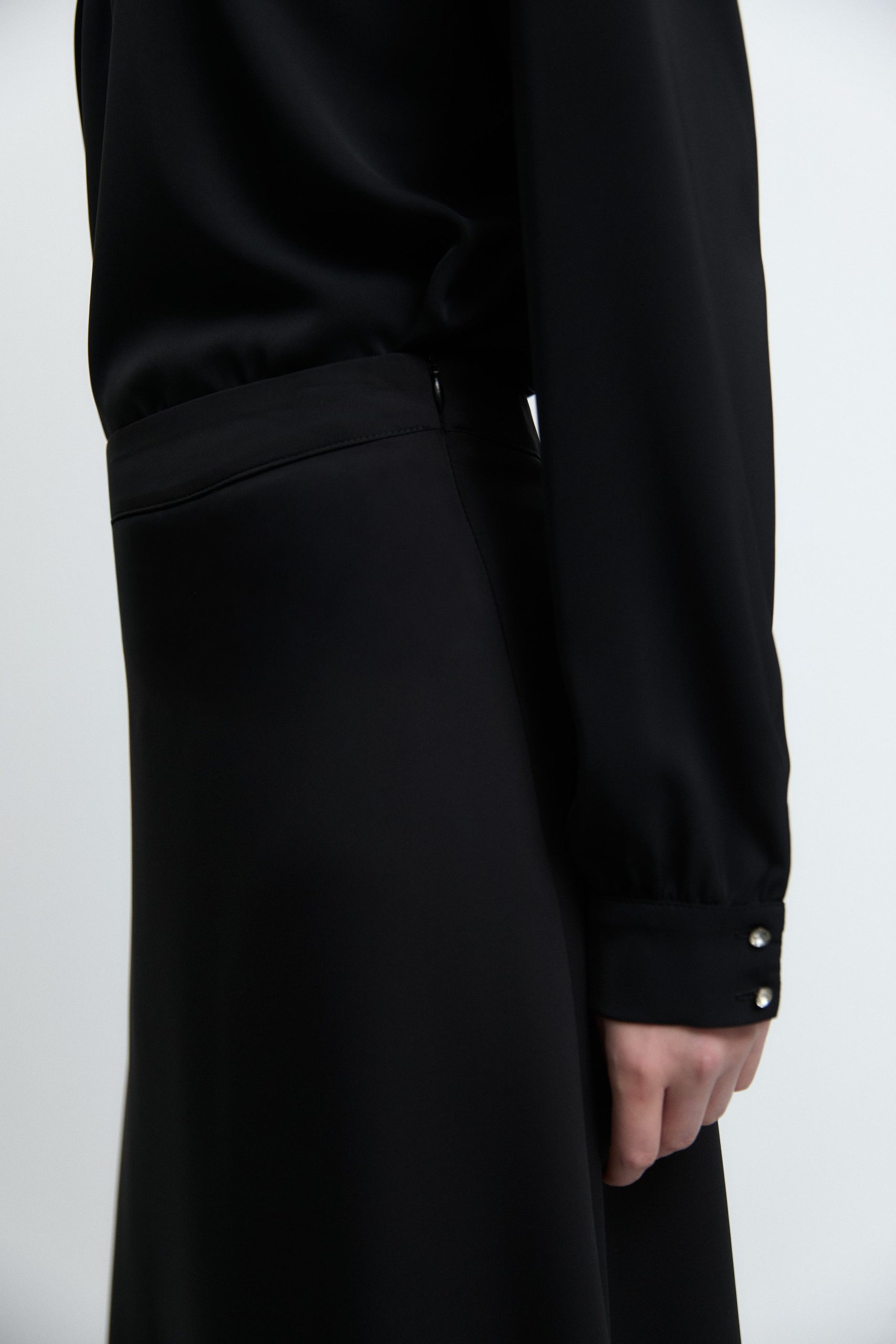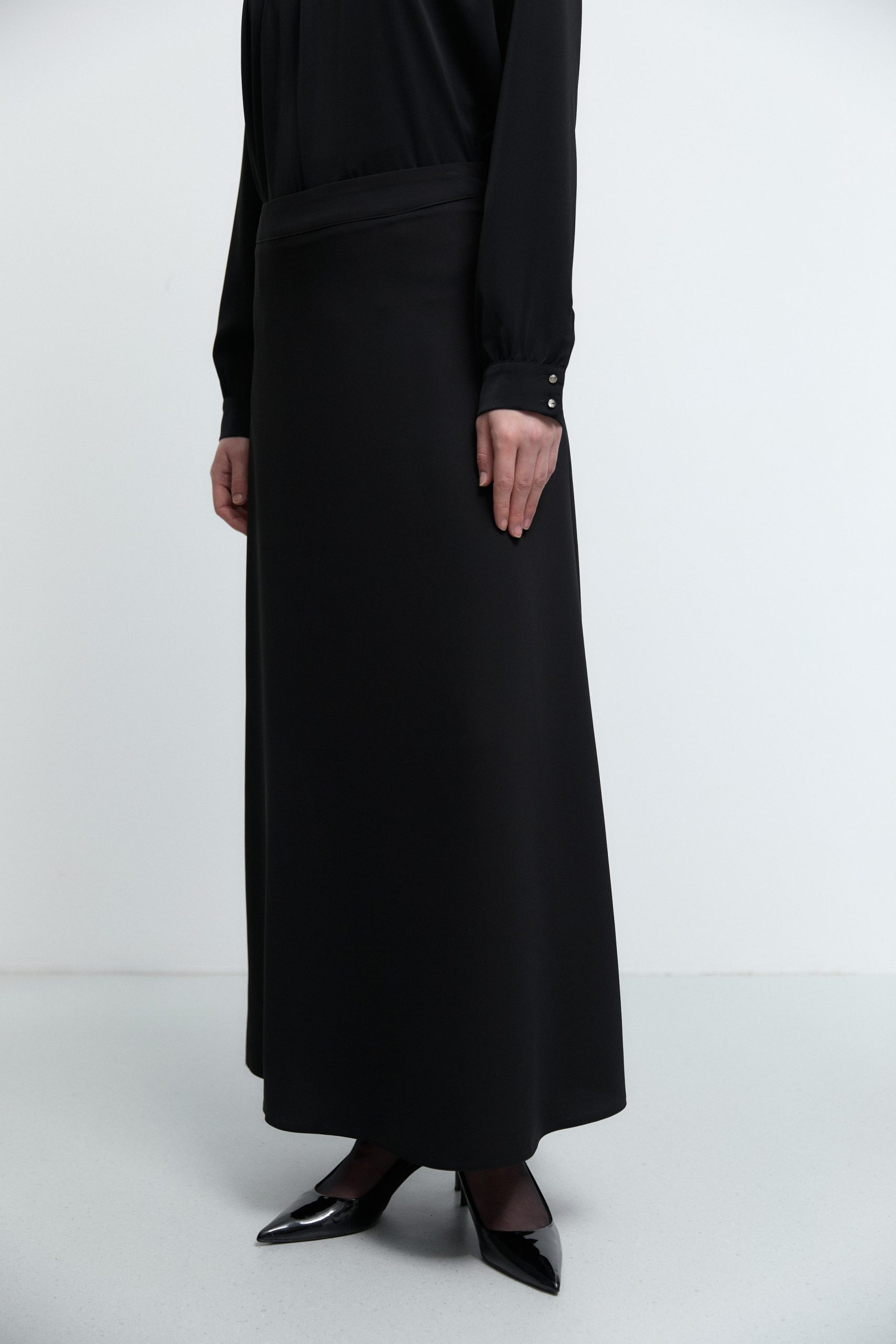 Akıcı ve bol kesimiyle zarif bir hareket sunan bu etek, modern minimalizmi feminen bir duruşla buluşturur.