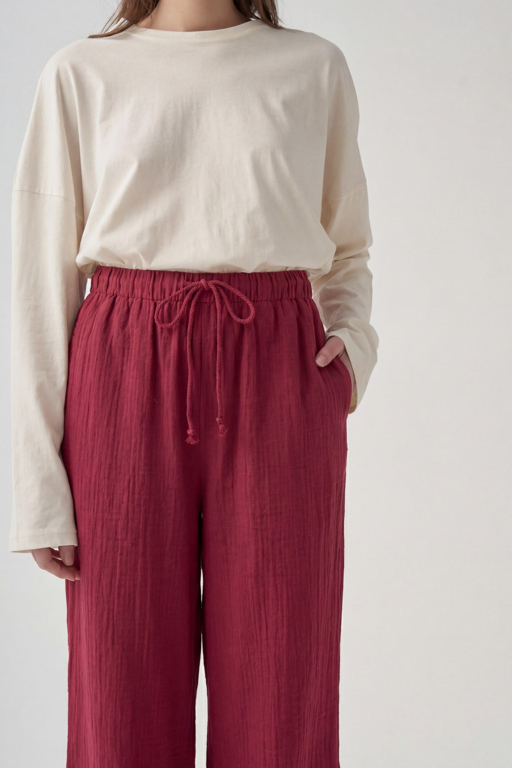 Şıklığı detaylarda arayanlara özel Bordo-Beli Lastikli Müslin Pantolon ile zarif bir görünüm yakalayın. Günlük ve özel kombinler için ideal tasarım