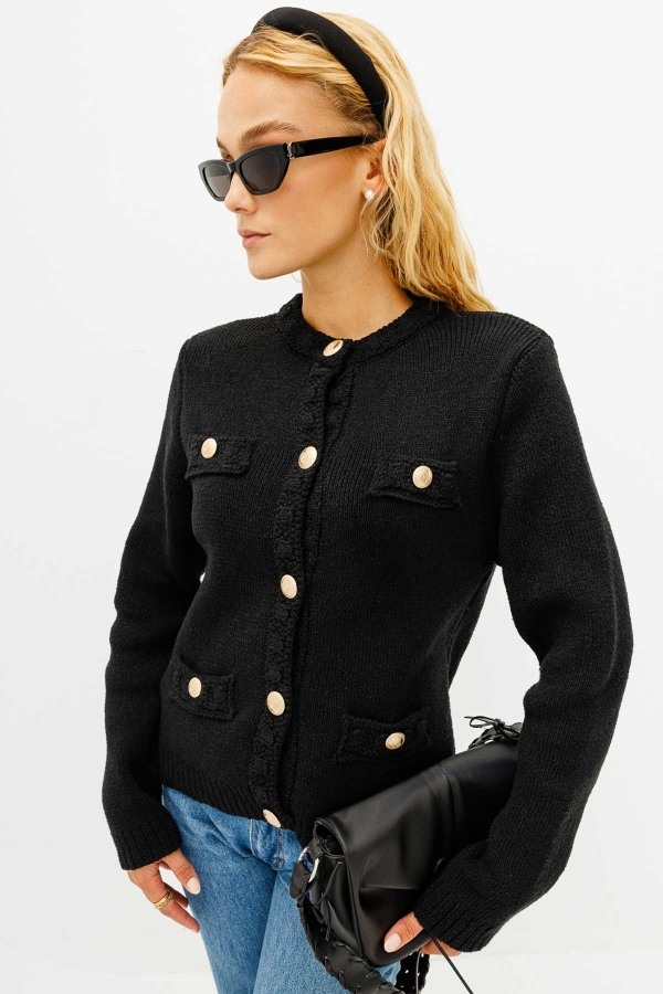 Bisiklet yaka, takma omuz, önden metal gold düğmeli, önden süs cepli buklet ipliklerden tasarlanmış dokulu hırka