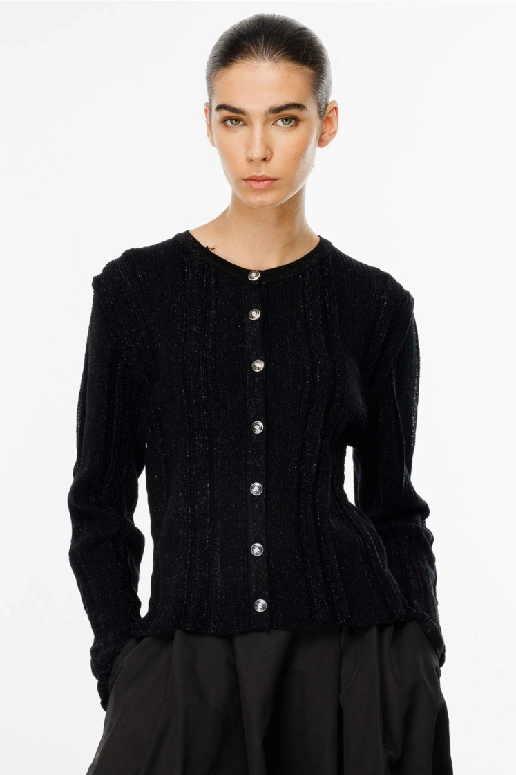 Bisiklet yaka, özel metalik renkli, düğmeli, fırfır dokulu, iç göstermeyen simli ipliklerden tasarlanmış, örgülü tasarım hırka.