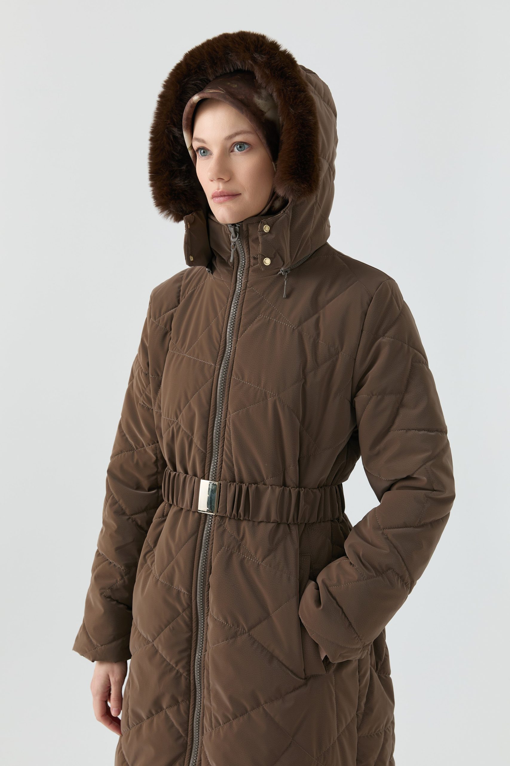 Cam Kırığı Desenli Kapitone Manto – Kahve
