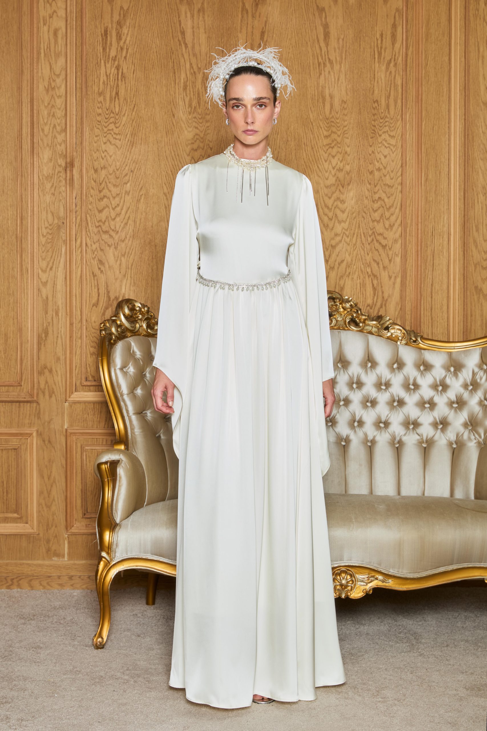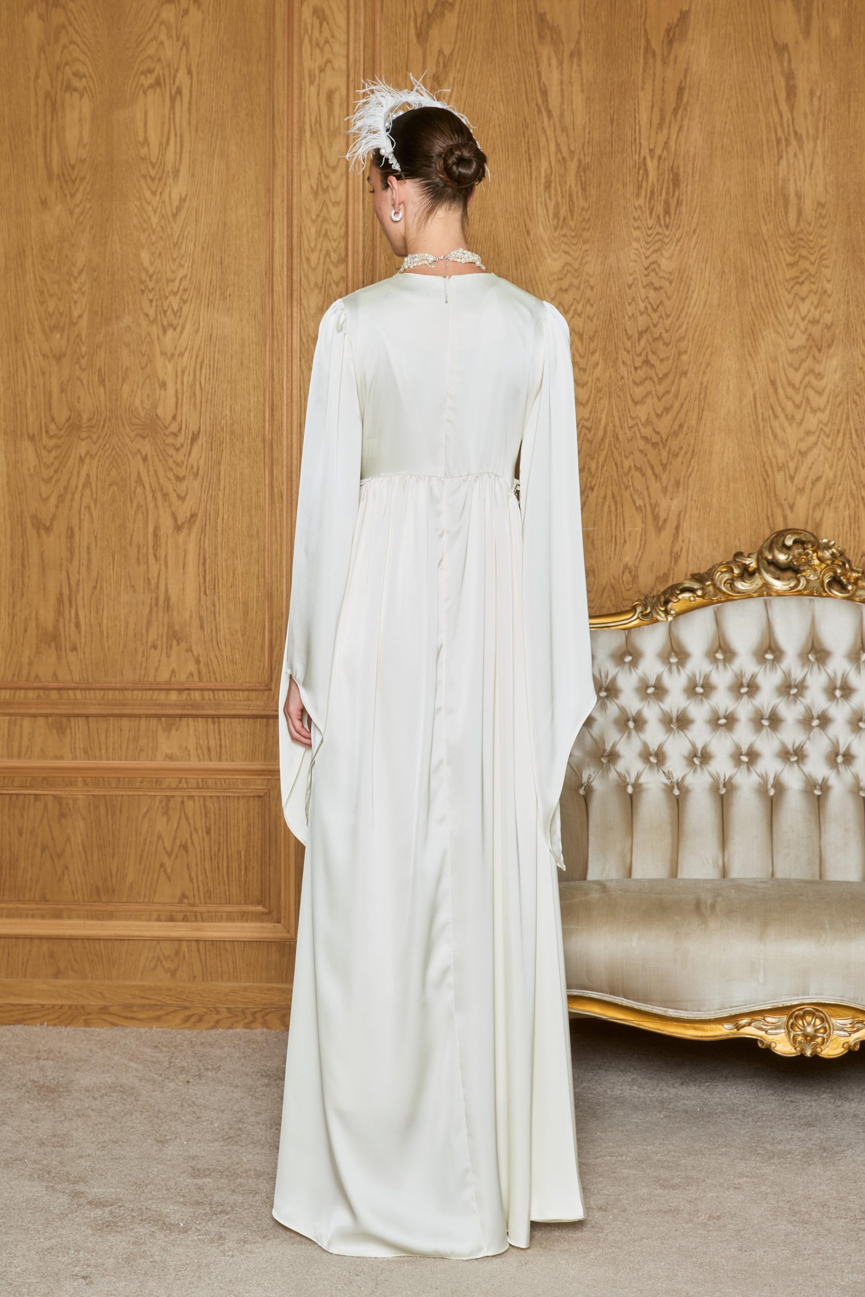 Işıltılı saten dokusuyla asil bir duruş sergileyen bu abiye, zarif kesimi ve inci detaylı kemeriyle şıklığı en sade haliyle yansıtıyor. Davetlerde ve özel günlerde sofistike bir görünüm arayanlar için ideal bir seçim.