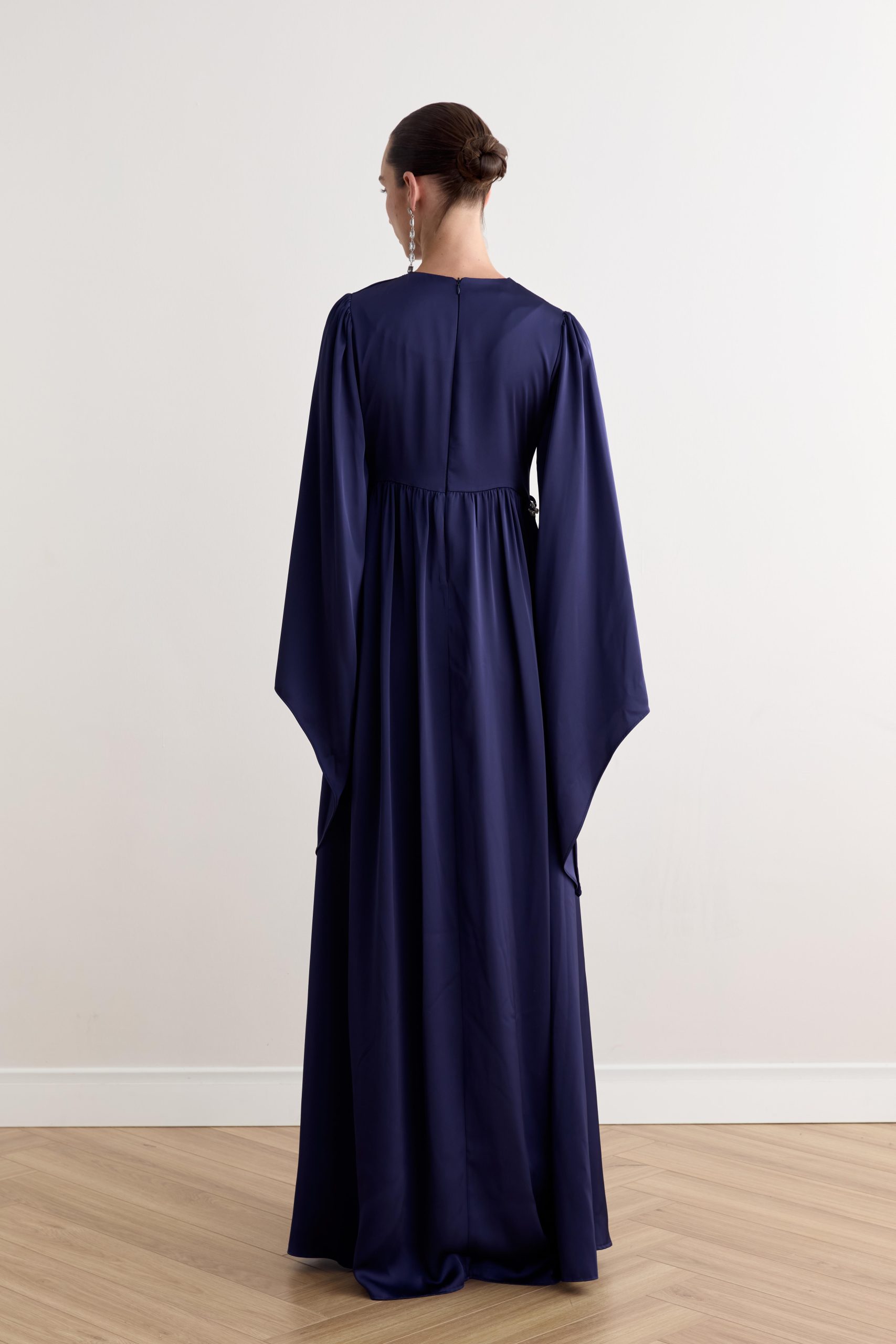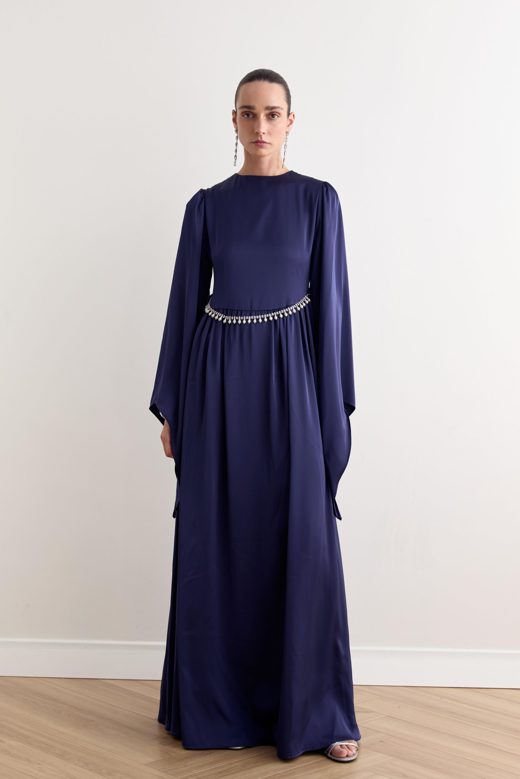 Işıltılı saten dokusuyla asil bir duruş sergileyen bu abiye, zarif kesimi ve inci detaylı kemeriyle şıklığı en sade haliyle yansıtıyor. Davetlerde ve özel günlerde sofistike bir görünüm arayanlar için ideal bir seçim.