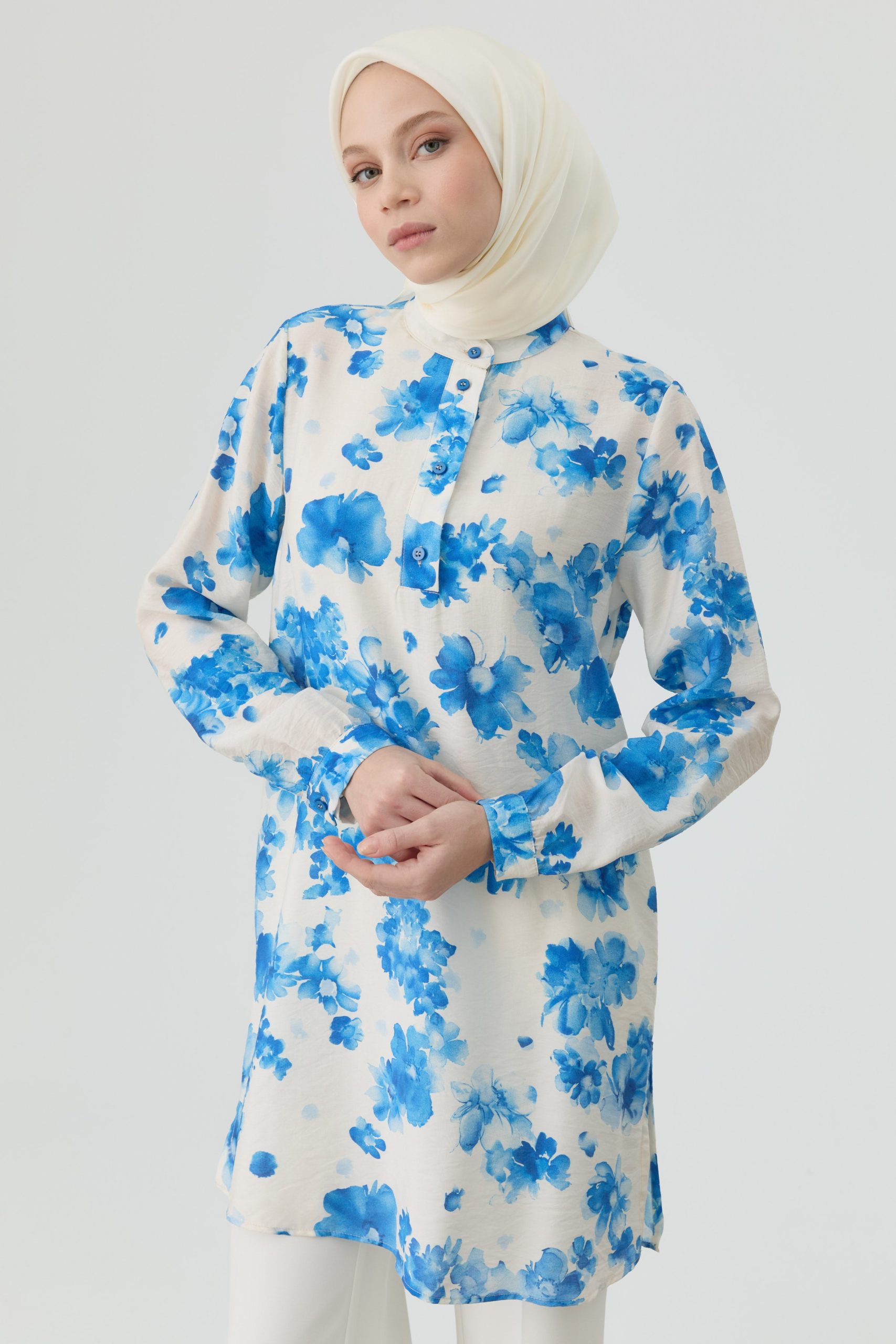 Romantik çiçek desenleriyle hareket kazanan bu tunik, yan yırtmaç detaylarıyla hem şıklığı hem de rahatlığı bir arada sunar.