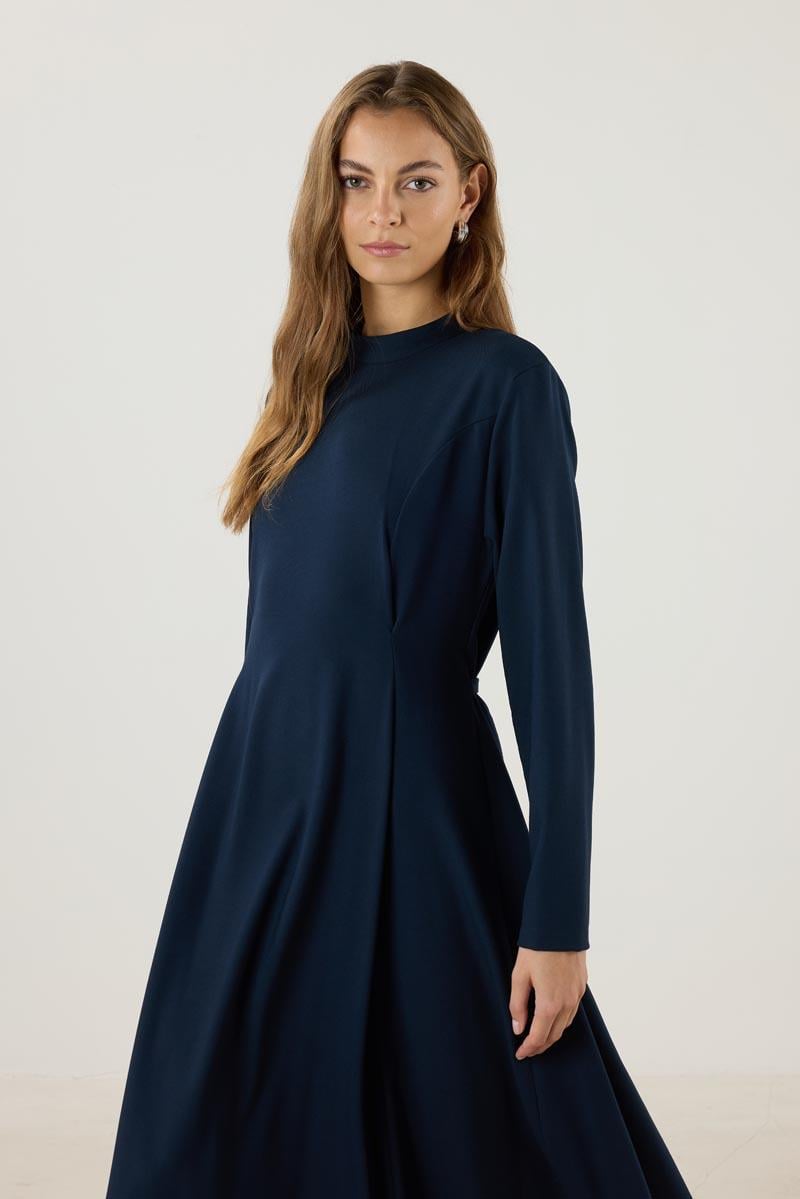 Çift Pileli Yüksek Yaka Elbise Lacivert