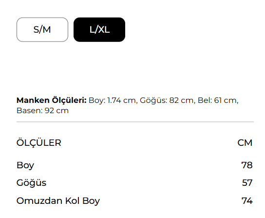 Manken Ölçüsü: Boy: 1.74 cm, Göğüs: 82 cm, Bel: 61 cm, Basen: 92 cm