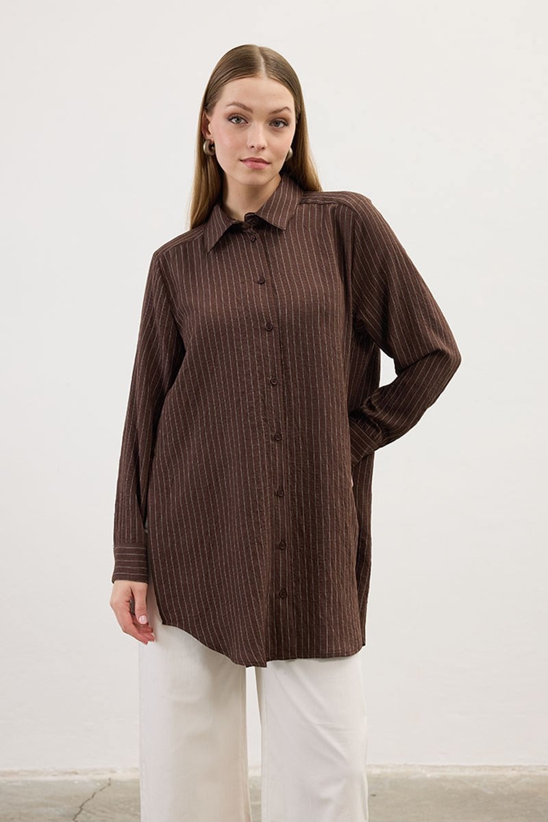 Geniş manşetli uzun kolları ve rahat kesimi sayesinde hareket özgürlüğü sunan tunik, hem günlük kombinlerde hem de ofis şıklığında rahatlıkla tercih edilebilir. Nötr ve pastel tonlardaki pantolonlarla mükemmel uyum sağlar, aynı zamanda topuklu sandaletler veya düz ayakkabılarla farklı stillere uyarlanabilir. Zarif taş tonu ile gardırobunuza taze ve huzurlu bir dokunuş katar.