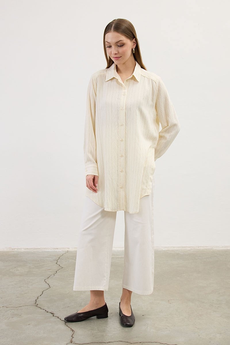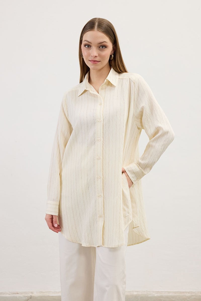 Doğal ve ferah bir görünüm sunan pudra rengi uzun tunik, yaz sezonunun hafif ve şık parçalarından biri. %88 Tencel ve %12 Pes karışımından üretilen kumaşı, yumuşak dokusu ve nefes alabilir yapısıyla gün boyu konfor sağlar. Minimal tasarımı, gizli patlı düğme detayı ve eteğinde yer alan zarif kavis kesimi ile modern bir duruş sergiler. Geniş manşetli uzun kolları ve rahat kesimi sayesinde hareket özgürlüğü sunan tunik, hem günlük kombinlerde hem de ofis şıklığında rahatlıkla tercih edilebilir. Nötr ve pastel tonlardaki pantolonlarla mükemmel uyum sağlar, aynı zamanda topuklu sandaletler veya düz ayakkabılarla farklı stillere uyarlanabilir. Zarif pudra tonu ile gardırobunuza taze ve huzurlu bir dokunuş katar.