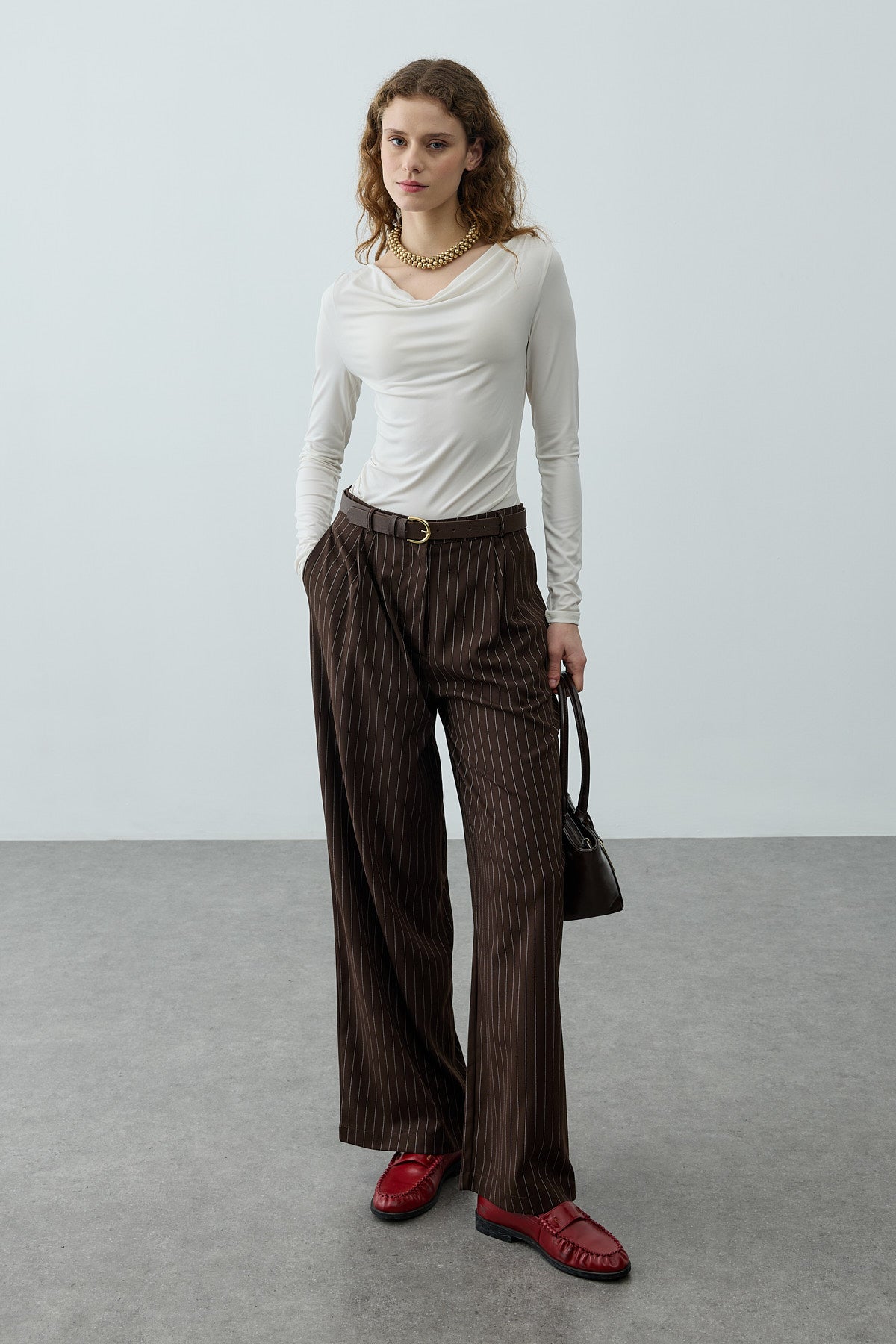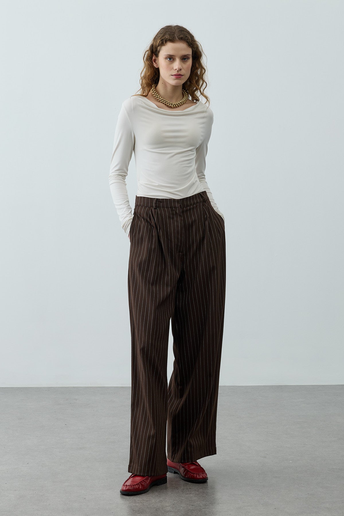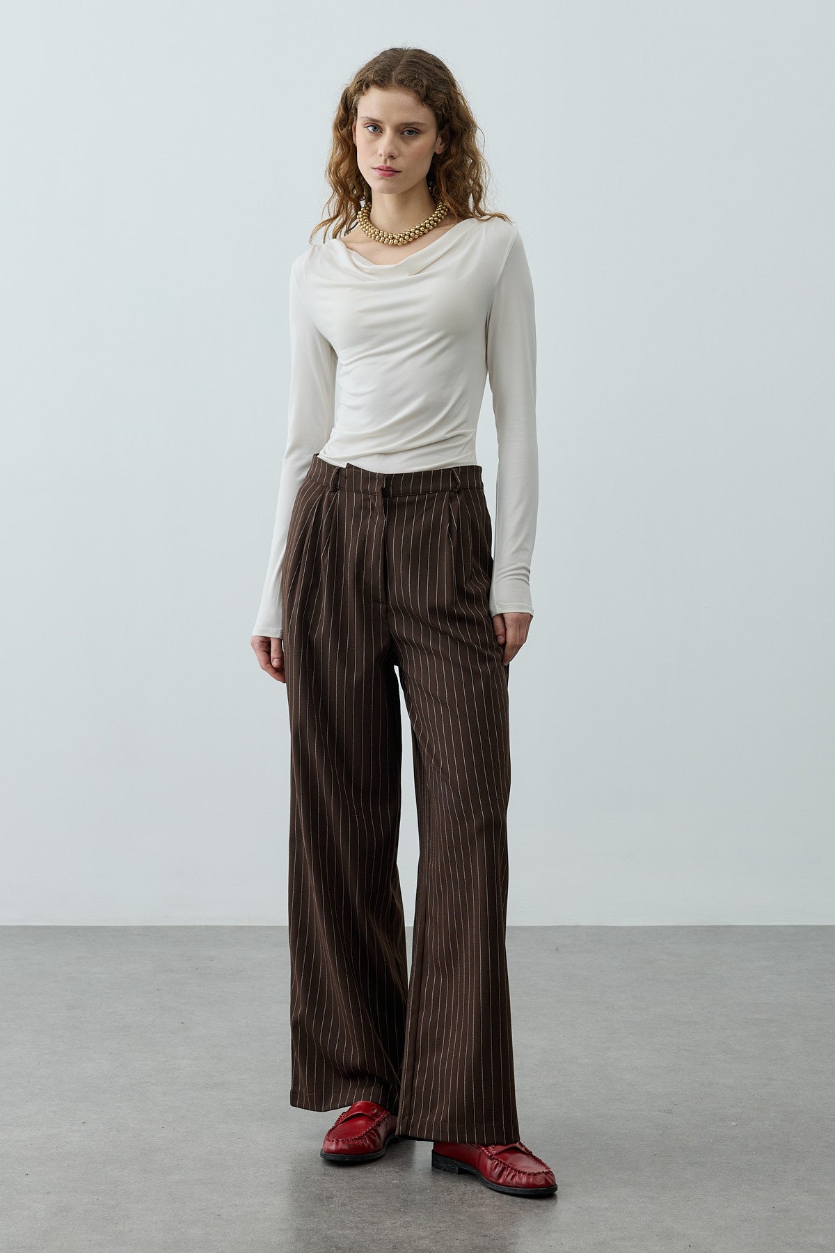 İnce dökümlü çizgili dokuma kumaştan üretilmiş, ön kısmı pileli, cepli, fermuar ve düğme kapamalı, palazzo kesim şık pantolon.