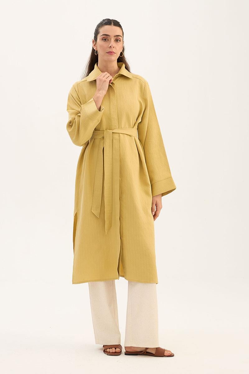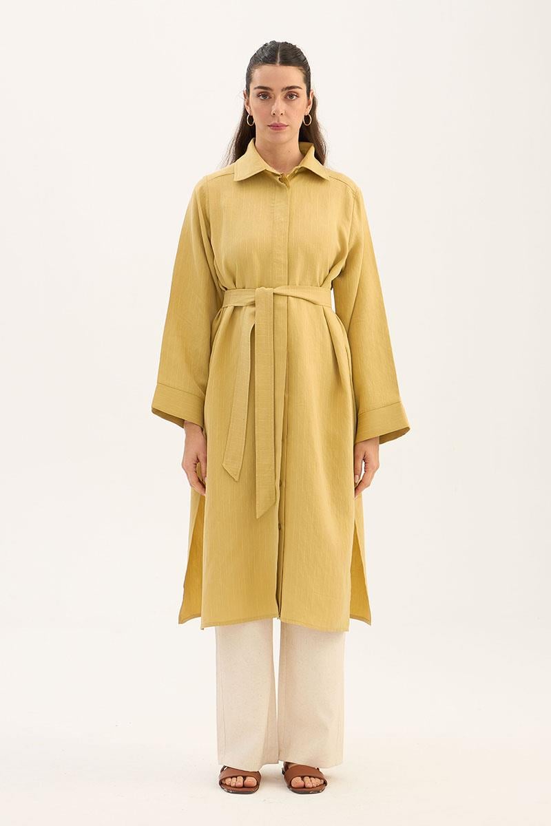 Doğal dokusu ve zarif çizgileriyle öne çıkan bu limon küfü rengi uzun tunik, yaz sezonunun ferah ve şık parçalarından biri. %88 Tencel ve %12 Pes karışımıyla üretilen kumaşı, hafiflik ve yumuşaklık sunarken nefes alabilir yapısıyla sıcak havalarda konfor sağlar. İnce çizgili dokusu modern bir görünüm kazandırırken, belde yer alan kendi kumaşından kuşak detayı ile vücuda uyumlu bir form oluşturur. Geniş manşetli uzun kolları ve yan yırtmaçları sayesinde hareket özgürlüğü sunan tunik, hem günlük kullanıma hem de özel gün kombinlerine uyum sağlar. Pantolonlar, dar paça taytlar veya uzun eteklerle kolayca kombinlenebilir. Zarif limon küfü tonu, pastel ve nötr renklerle mükemmel bir uyum yakalayarak stilinize romantik bir dokunuş katar.