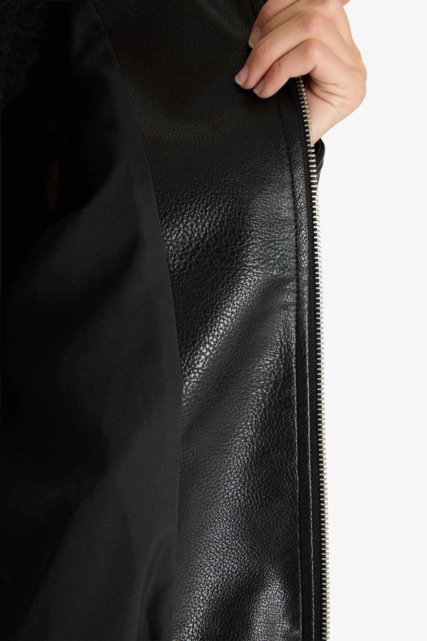 Dad Fit Dik Yaka Fermuarlı Suni Deri Ceket