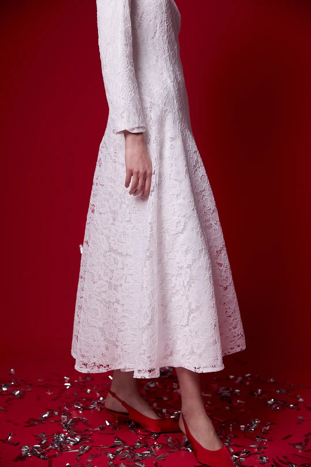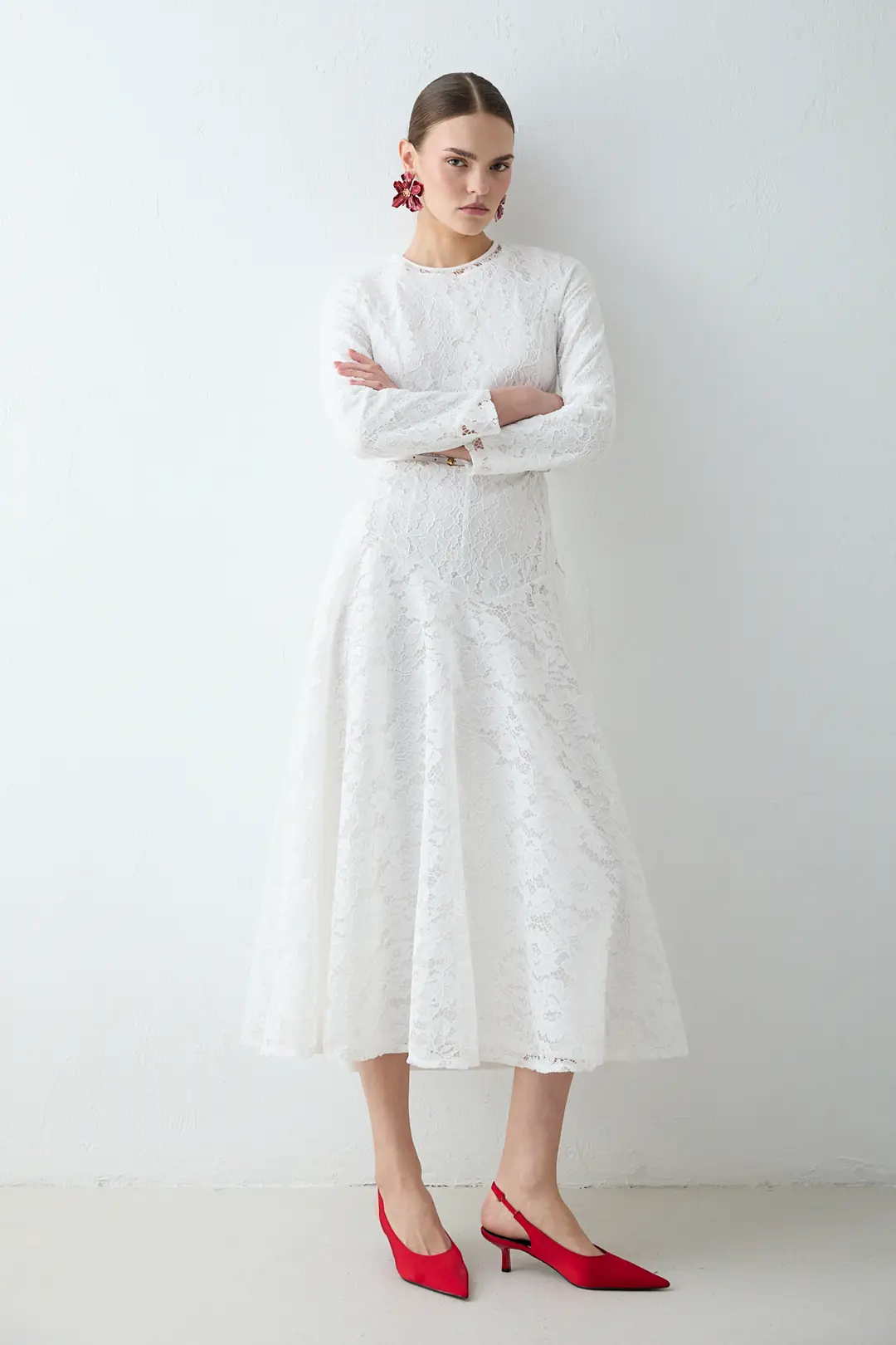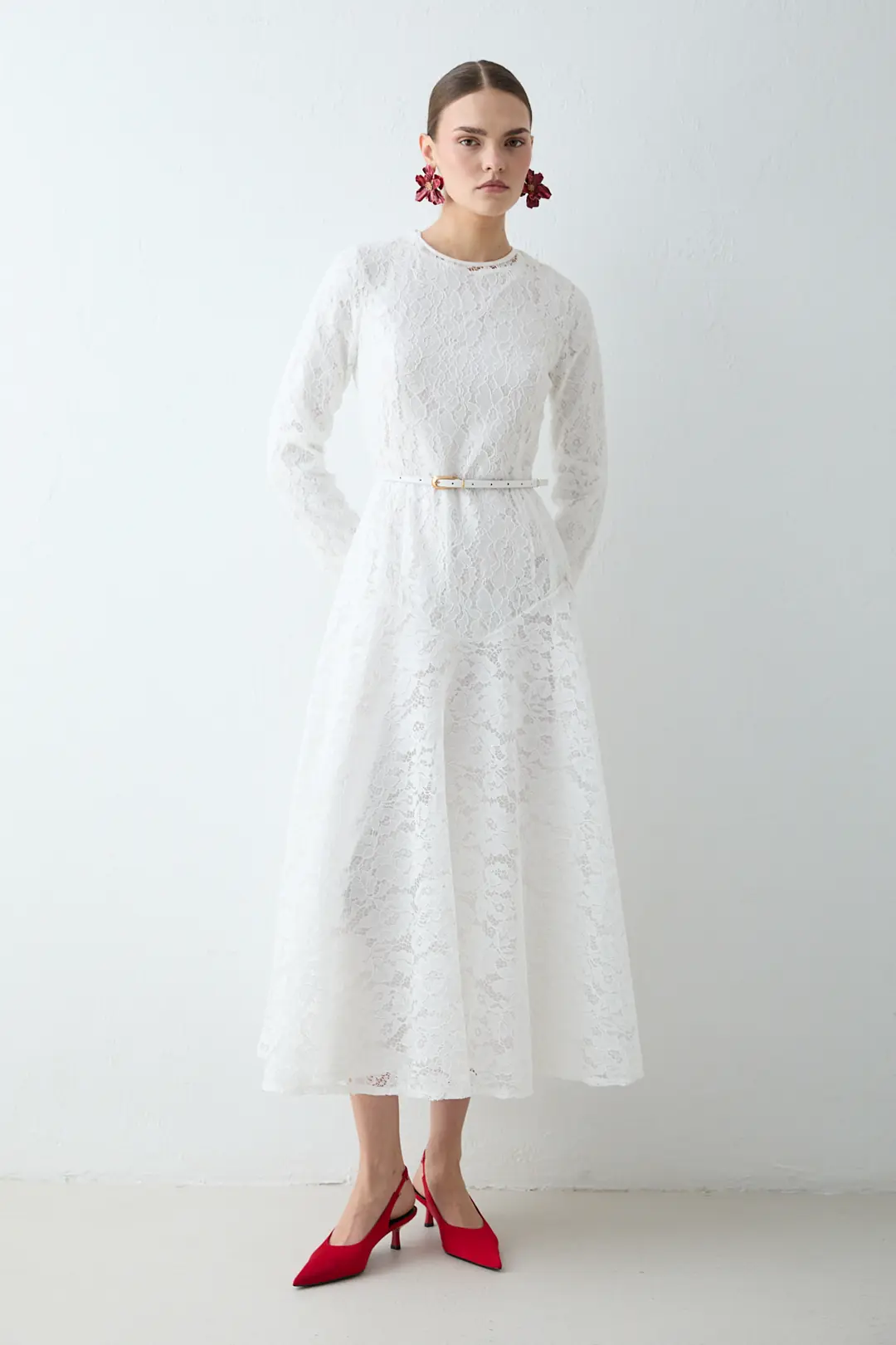 Bisiklet yaka tasarımı ve yaka arkasındaki 55 cm fermuar detayıyla zarif bir duruş sunan dantel elbise, ince seyyar kemeri ve seyyar astarıyla birlikte rahat ve şık bir kullanım sağlar. Hafif yapısı sayesinde özel günlerde konforlu bir alternatif sunar. Dantel kumaşın zarif dokusu modele feminen bir görünüm kazandırır.