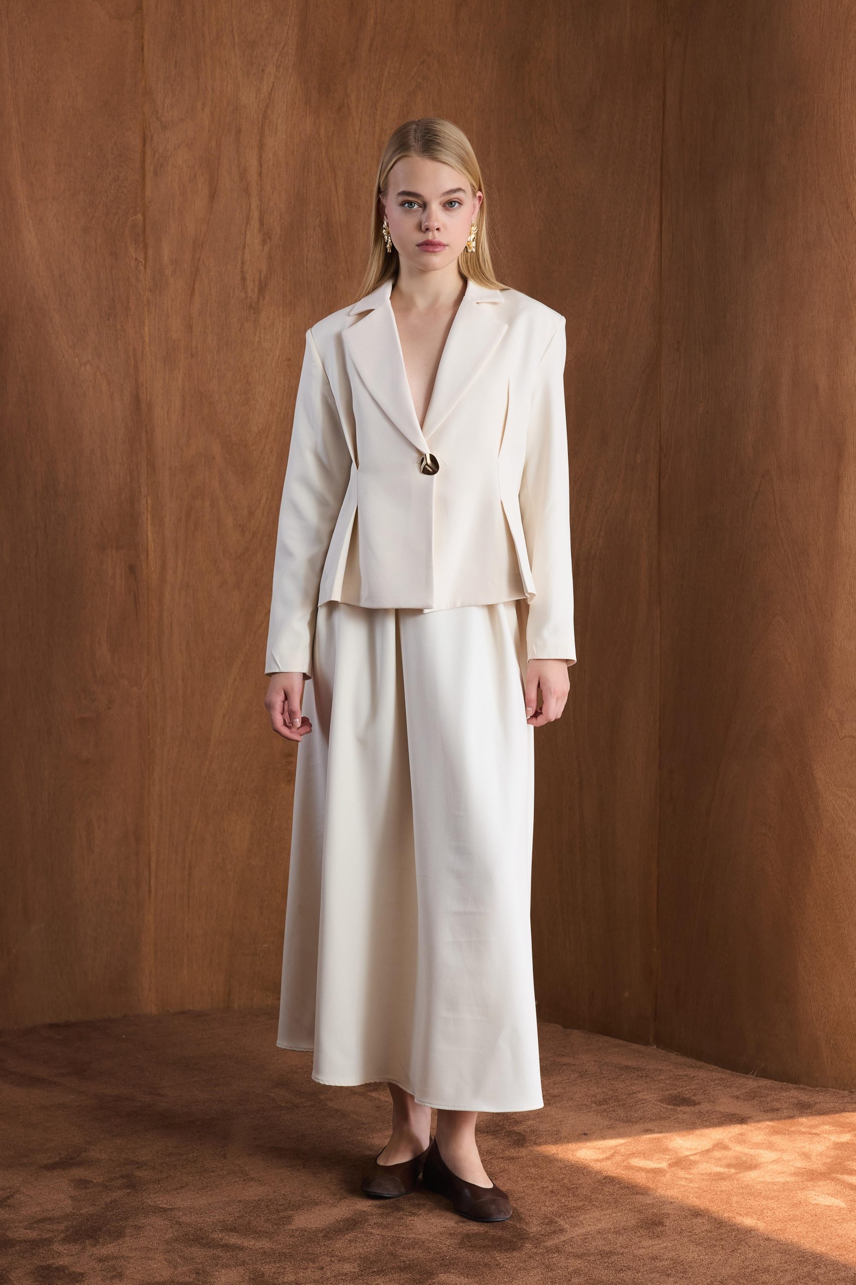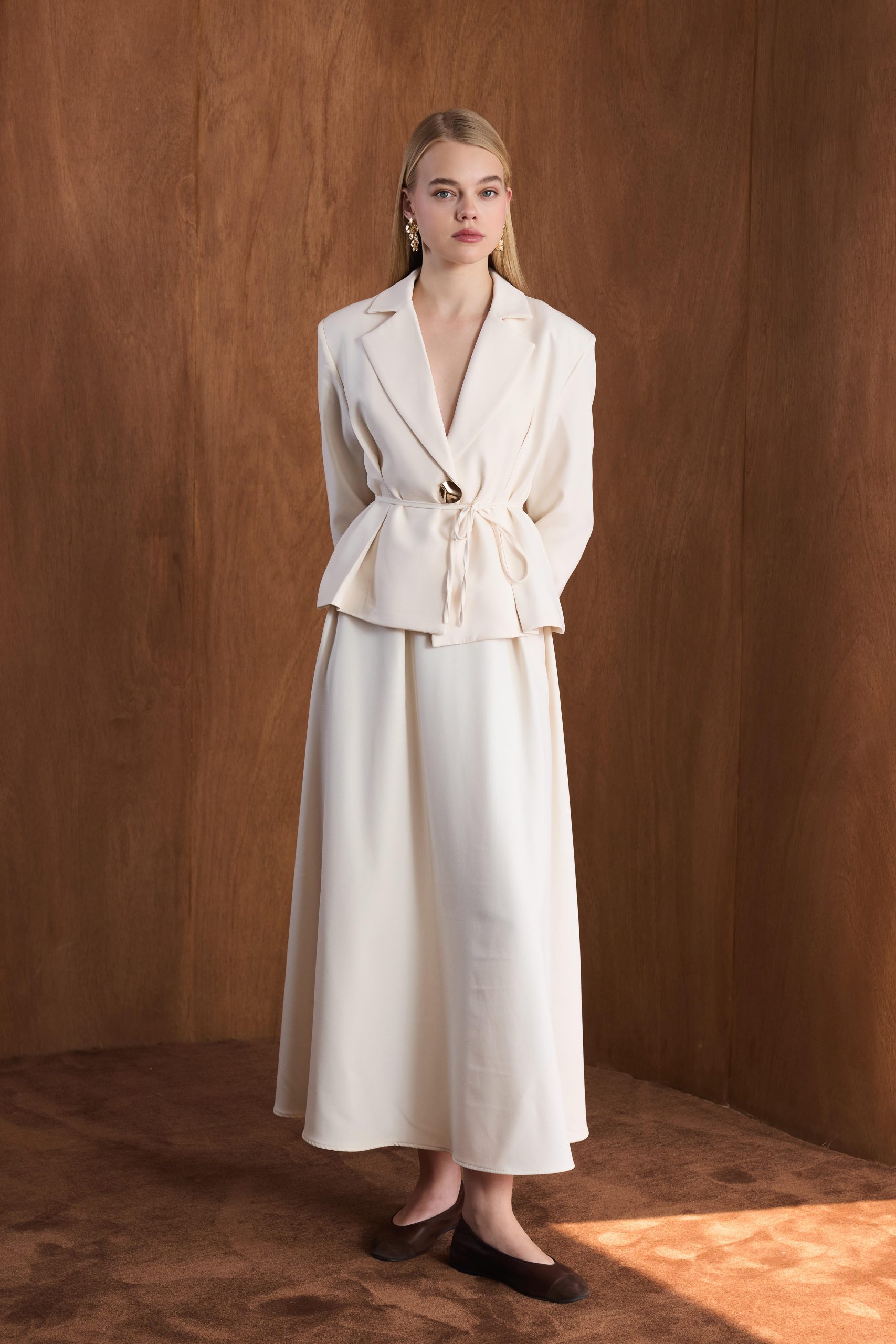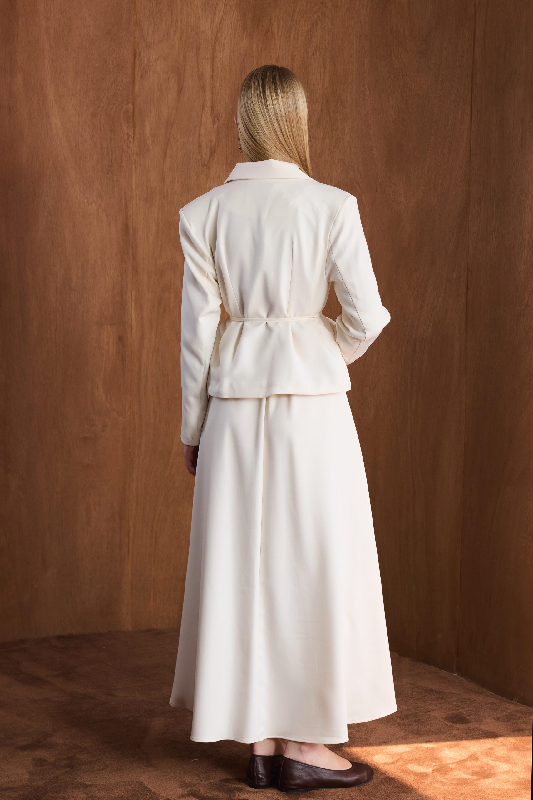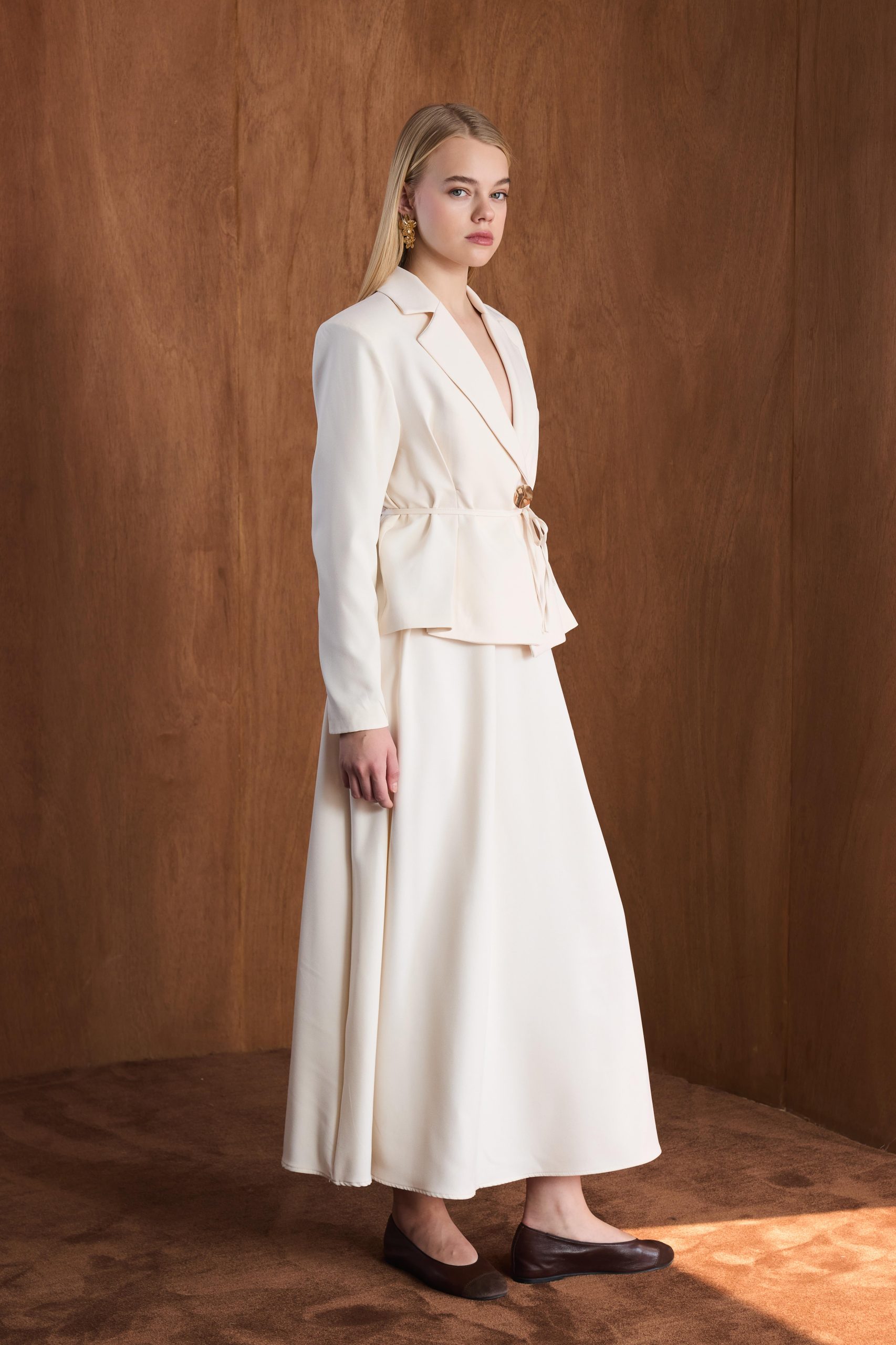 Doğal zarafet ve sade şıklığın buluştuğu bu takım, şehirli kadının modern stil anlayışını yansıtır. Gün boyu konfor sunarken, zamansız çizgileriyle her dönemde gardırobun vazgeçilmezi olur. Ceket formundaki üst parça, bel kısmındaki zarif kemer detayıyla vücut hatlarını nazikçe vurgular. Uzun etek tasarımı ise akıcı duruşuyla sofistike bir siluet oluşturur.