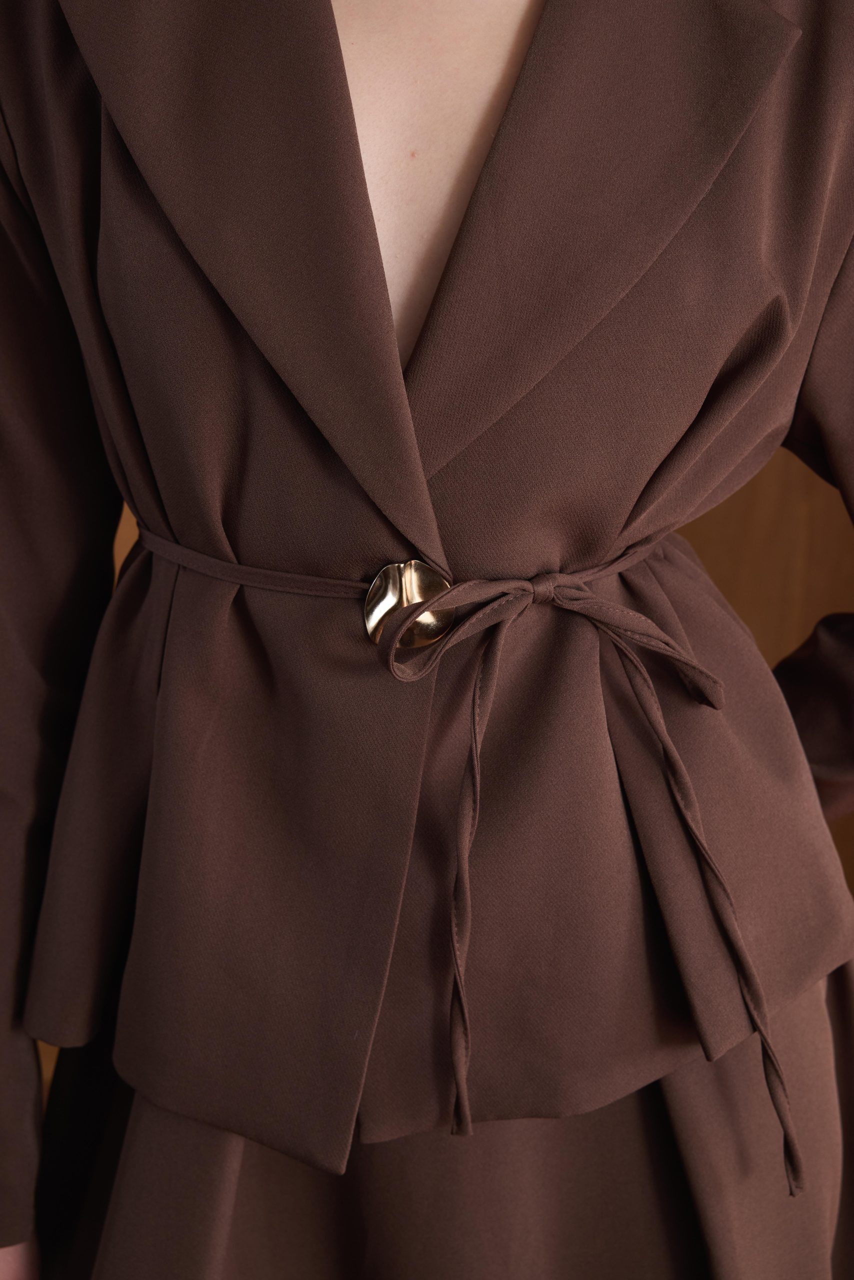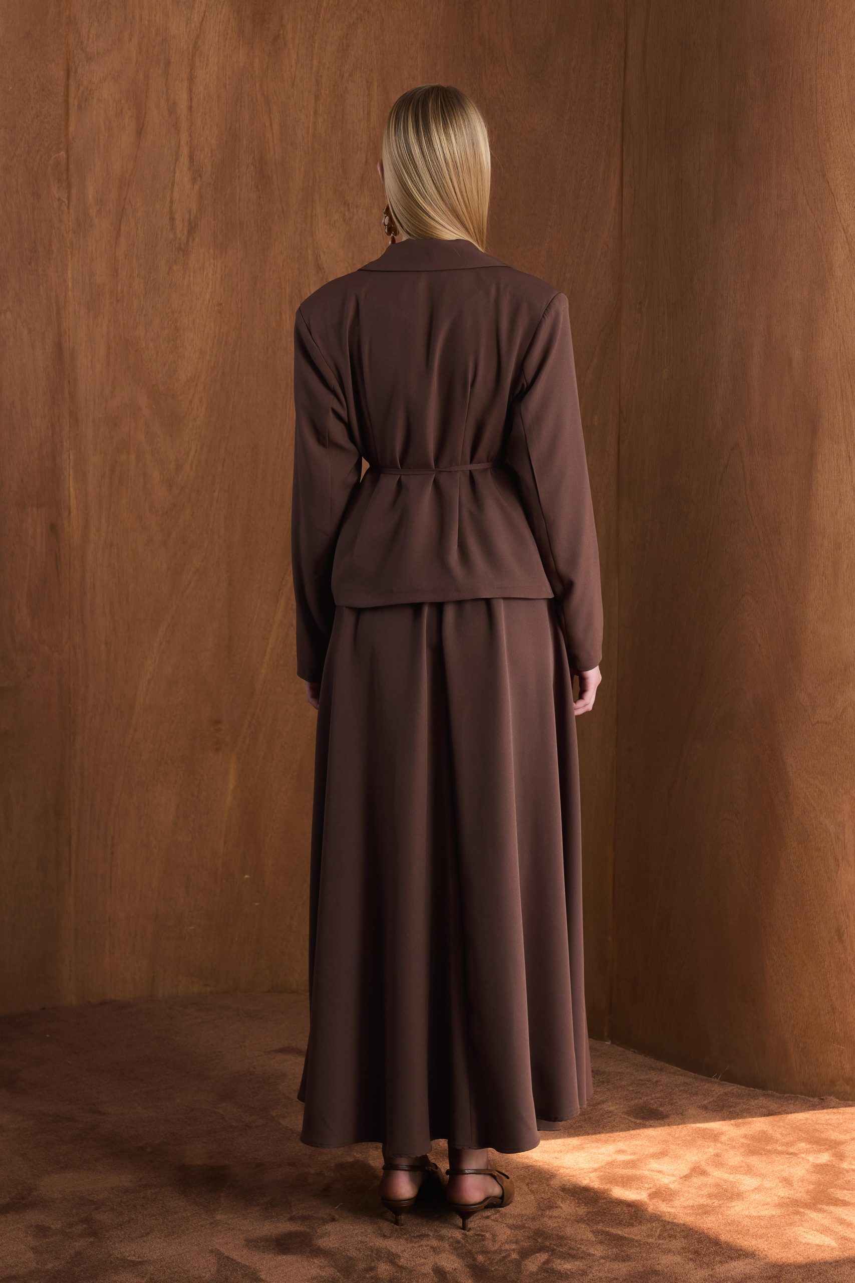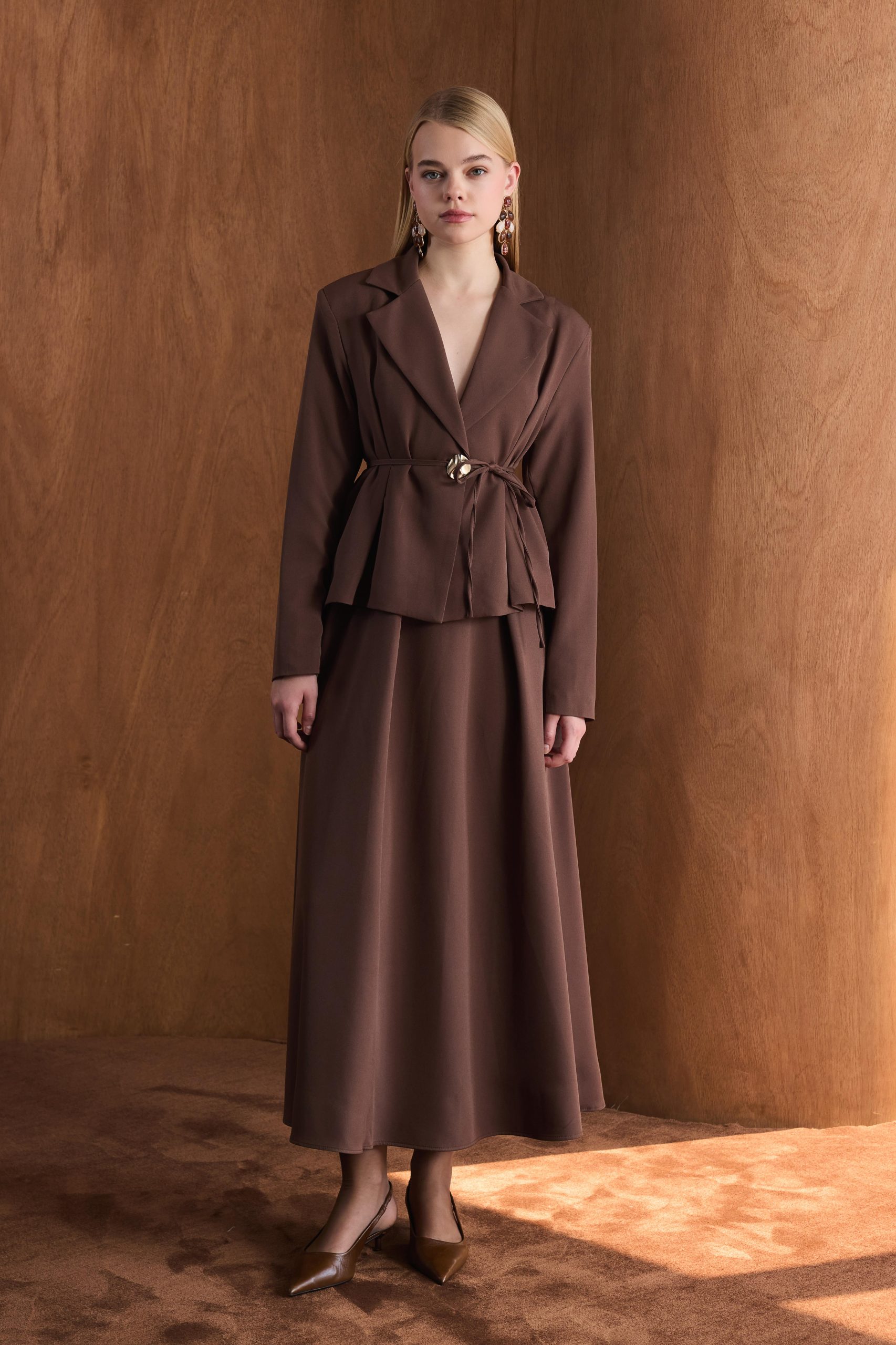 Doğal zarafet ve sade şıklığın buluştuğu bu takım, şehirli kadının modern stil anlayışını yansıtır. Gün boyu konfor sunarken, zamansız çizgileriyle her dönemde gardırobun vazgeçilmezi olur. Ceket formundaki üst parça, bel kısmındaki zarif kemer detayıyla vücut hatlarını nazikçe vurgular. Uzun etek tasarımı ise akıcı duruşuyla sofistike bir siluet oluşturur.