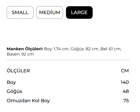 Manken Ölçüsü: Boy: 1.74 cm, Göğüs: 82 cm, Bel: 61 cm, Basen: 92 cm