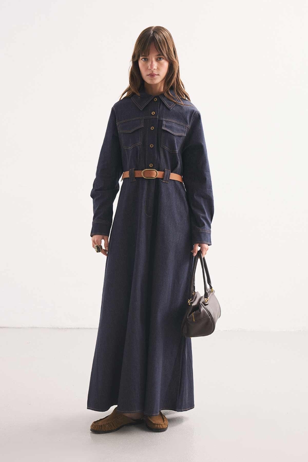 Zamansız denim dokusunu modern bir kesimle buluşturan bu elbise, sade ama güçlü bir siluet oluşturur. Hafif dokusu ve akıcı formu sayesinde gün boyu konfor sağlarken, özenli dikiş detayları tasarıma sofistike bir duruş kazandırır.