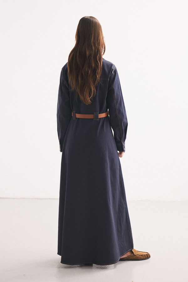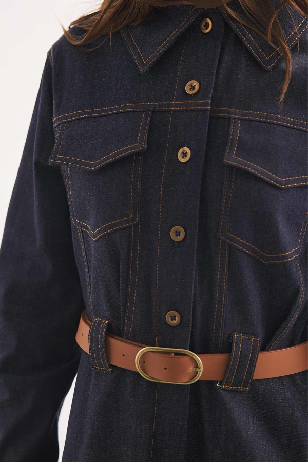 Gömlek yaka, önden yarım düğme ve fermuar kapamalı, kemer aksesuarlı, kemer köprülü, önden cep detaylı, tam kalıp, denim görünümlü kemerli elbise.