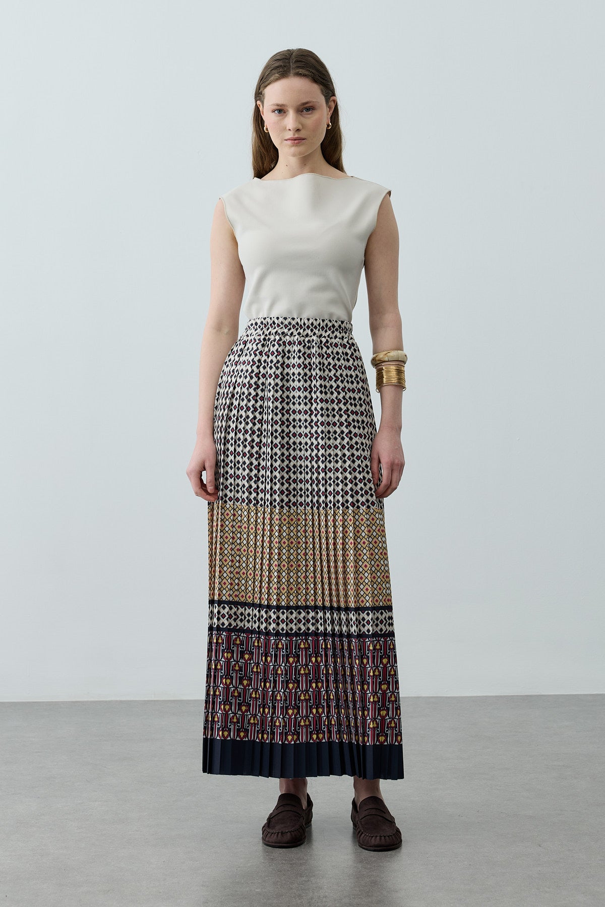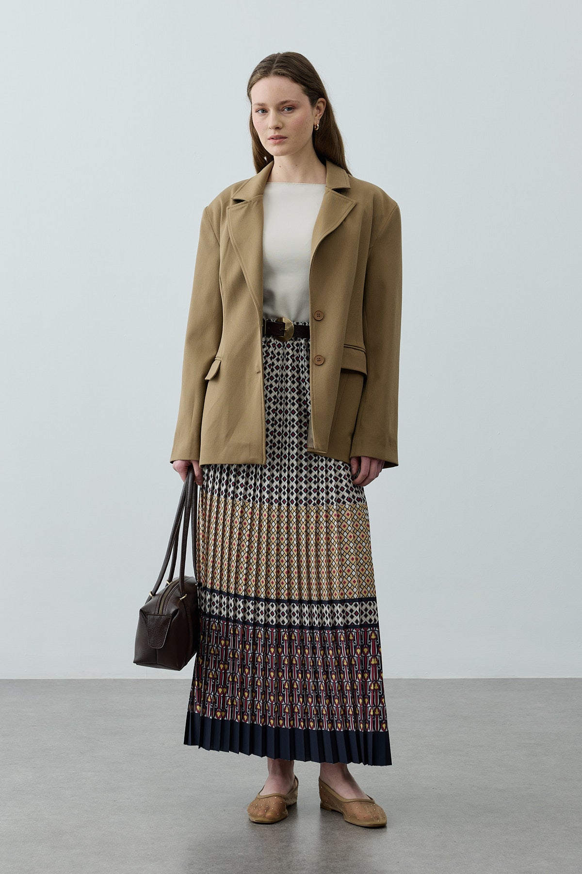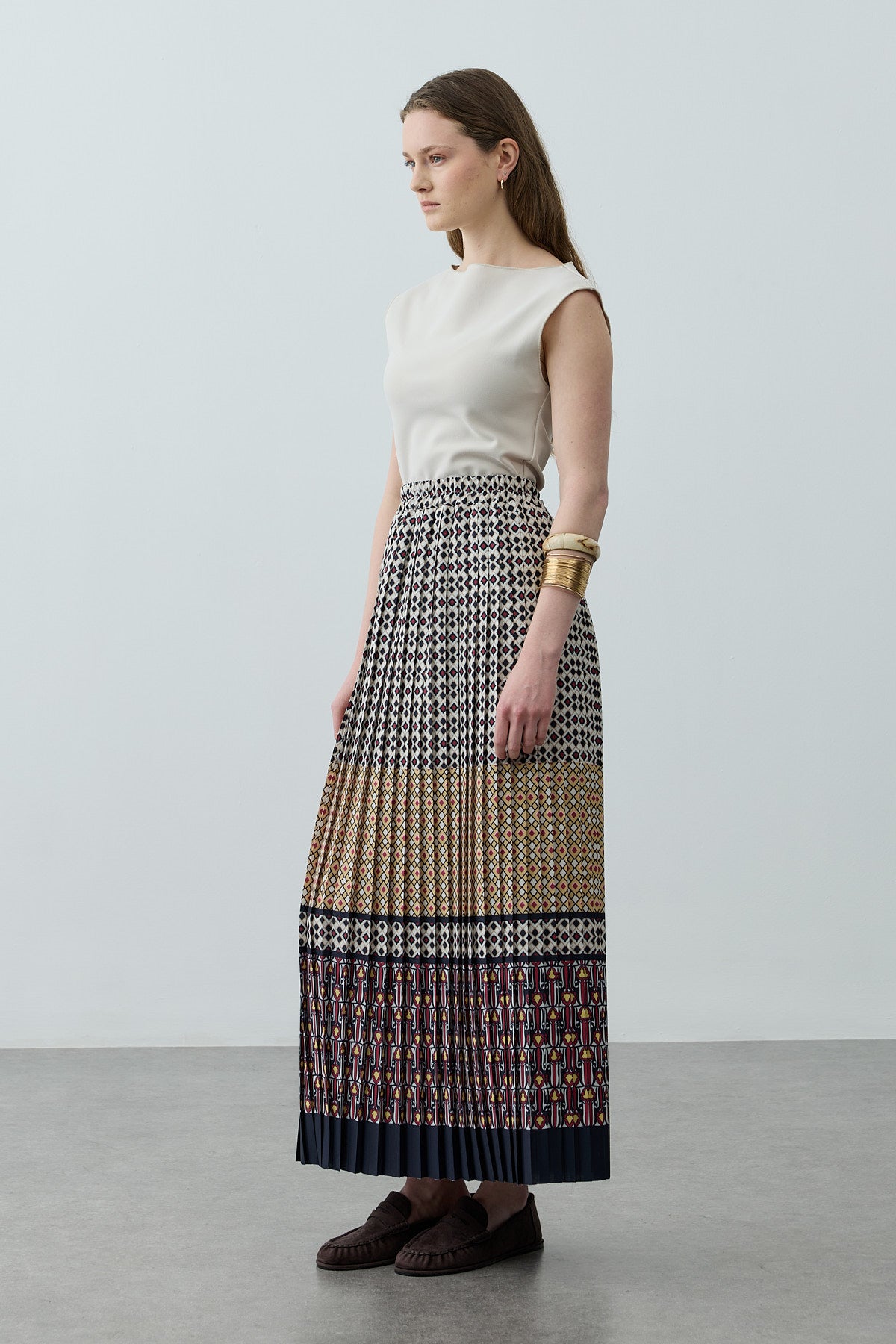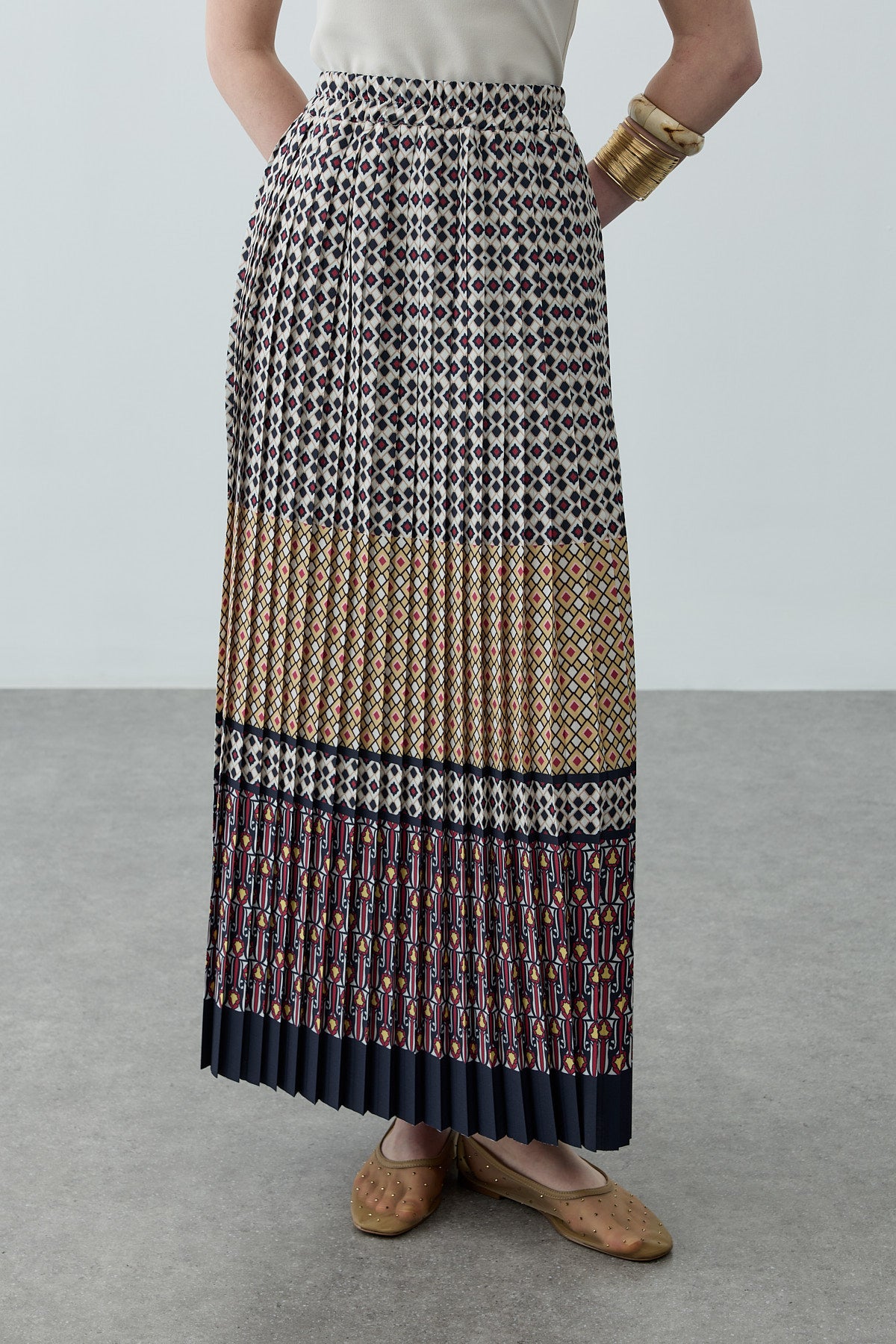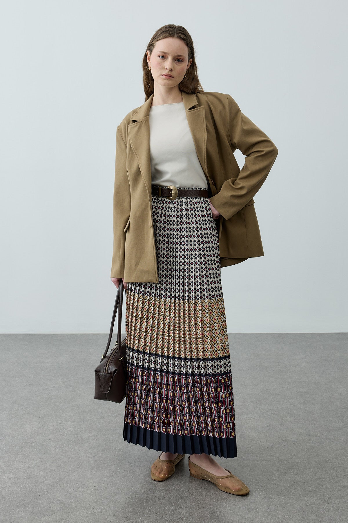 Dokuma dökümlü kumaştan, beli lastikli, desenli, piliseli, maxi etek.
