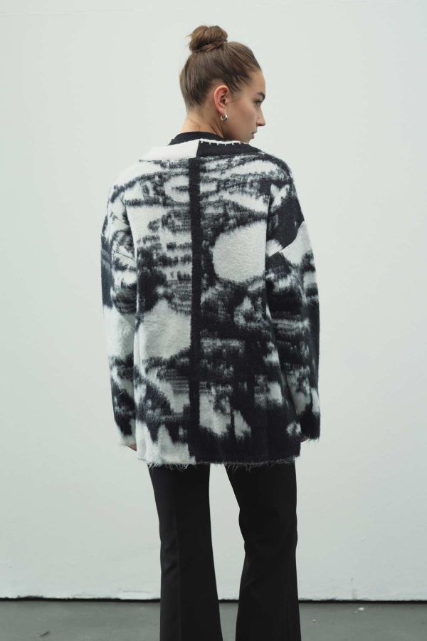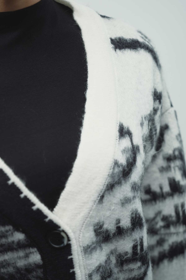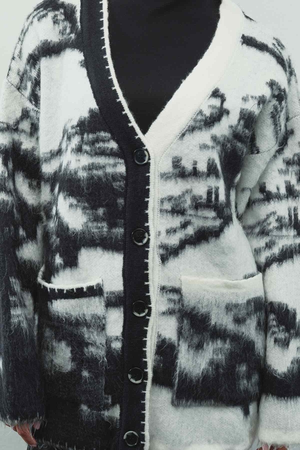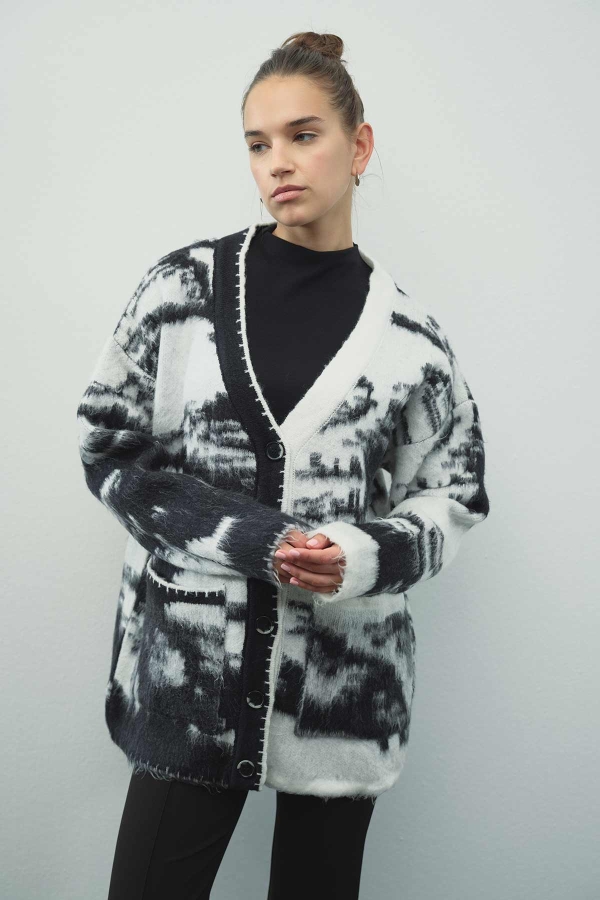 Şardonlanmış, özel ipliklerden tasarlanmış, desenli hırka, V yaka, dikiş detaylı, önden düğmeli, bol kesim hırka.