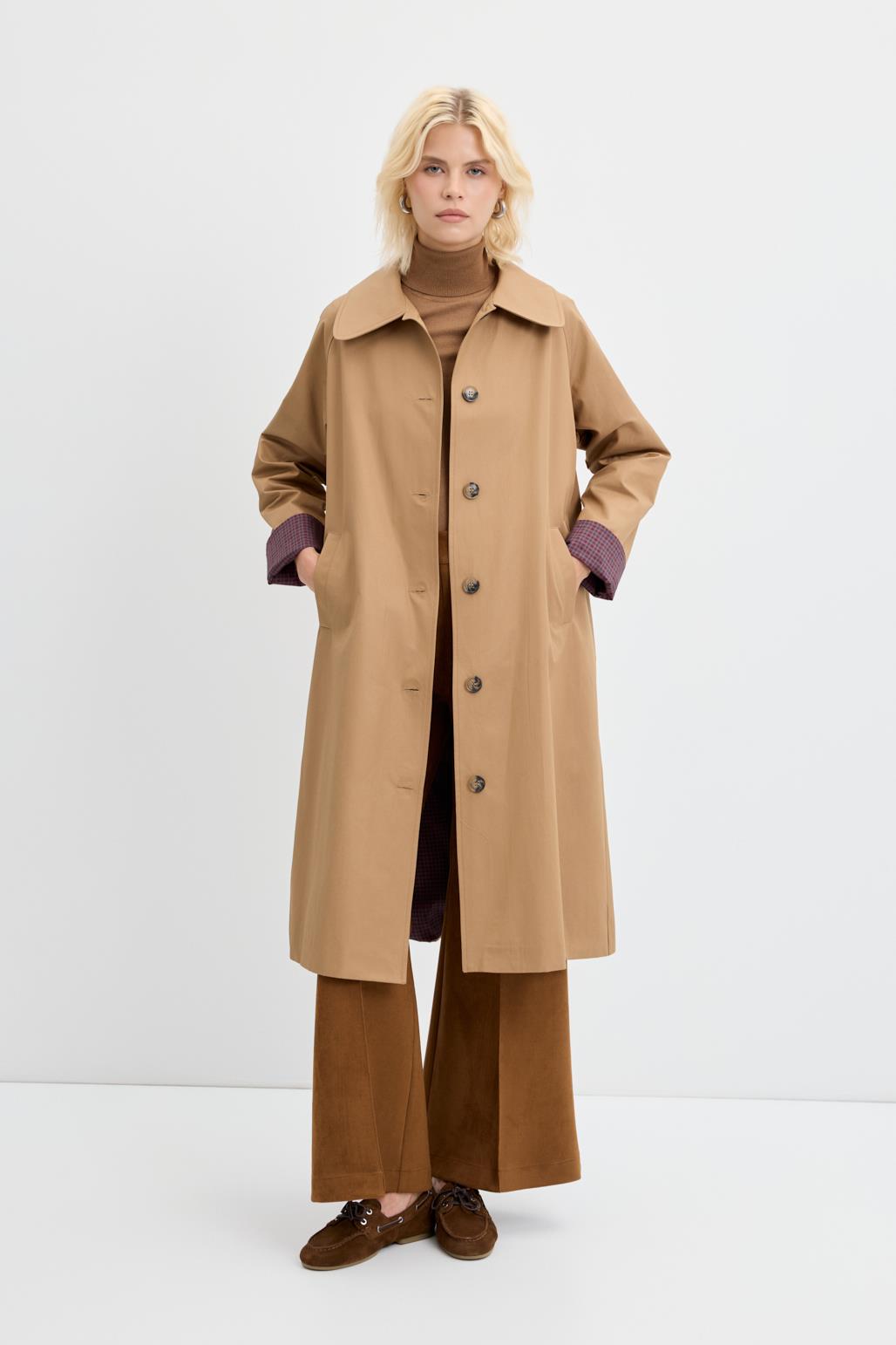 Pamuk karışımlı gabardin kumaştan üretilmiş bu deve tüyü renkli uzun trençkot, hem estetik bir görünüm hem de konfor sunar. Geniş yakası ve uyumlu desenli astarı şık bir görünüm sağlarken, arka etek kısmındaki yırtmaç hareket özgürlüğü sağlar. Katlanabilir kol uçları pratik bir kullanım sunar. Düğme kapatma ve ayarlanabilir kuşak ile belinizi istediğiniz gibi şekillendirebilirsiniz. Geniş ve rahat kesimi günlük kıyafetlere kolayca uyum sağlar.