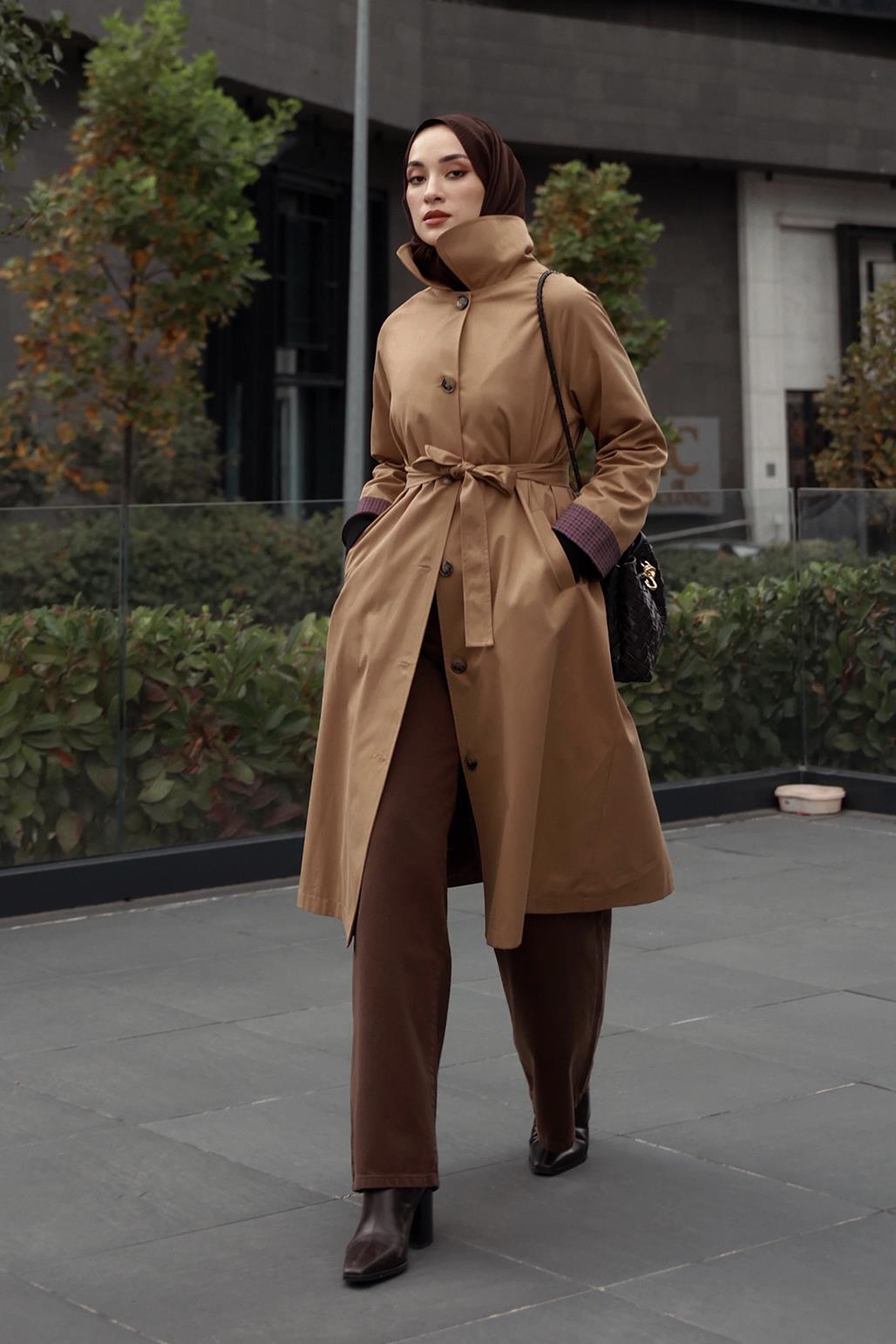Deve Tüyü Renkli, Ekose Astarlı Kuşaklı Uzun Trençkot