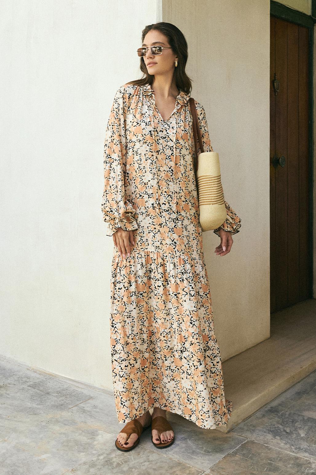 Diane Viskon Fırfırlı Uzun Elbise Soft Oranj