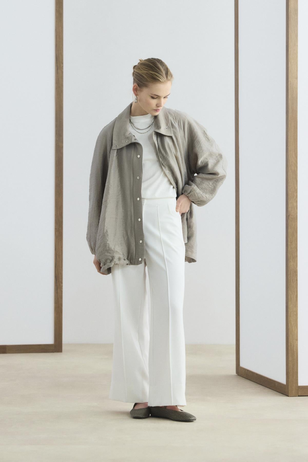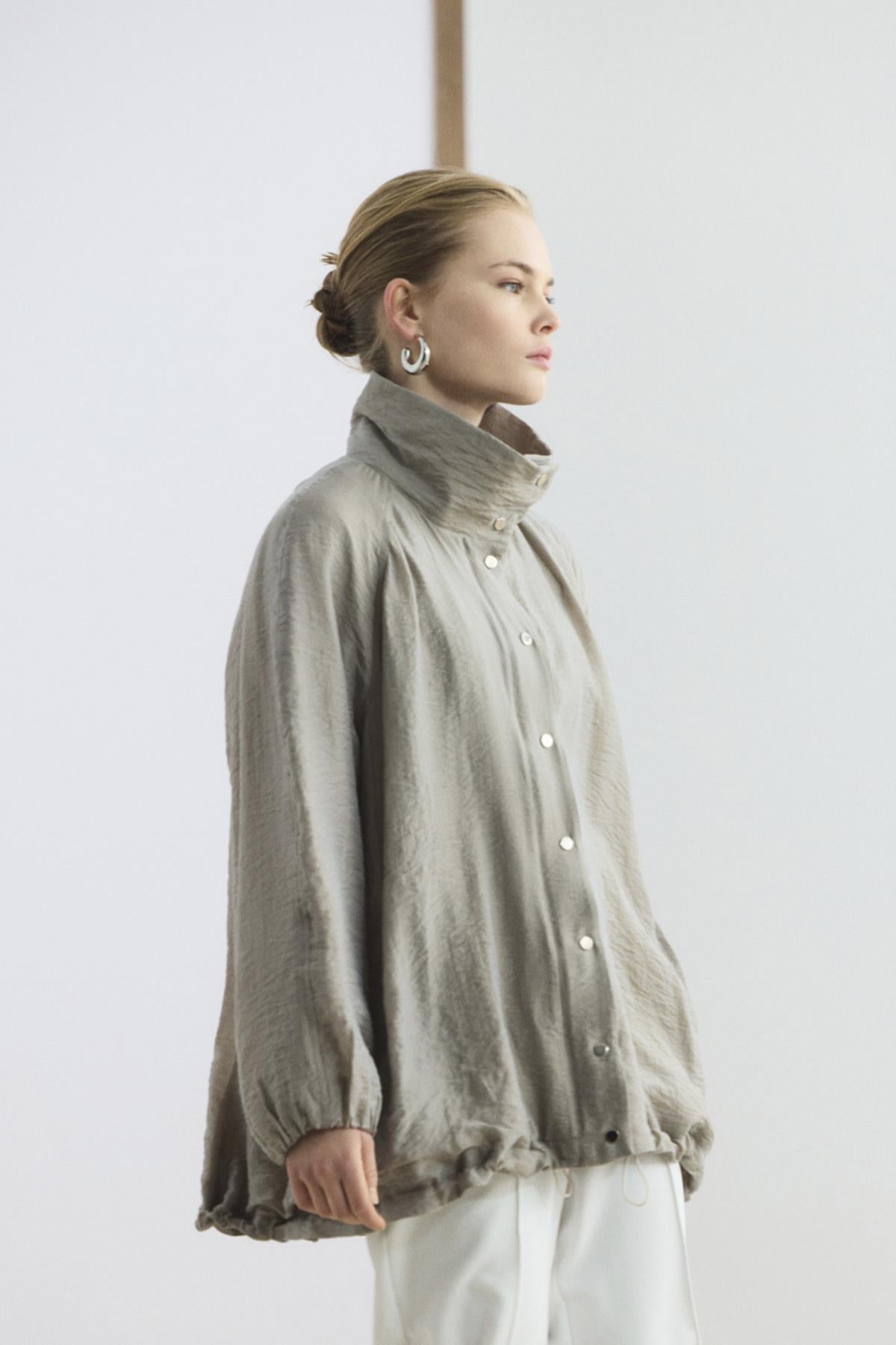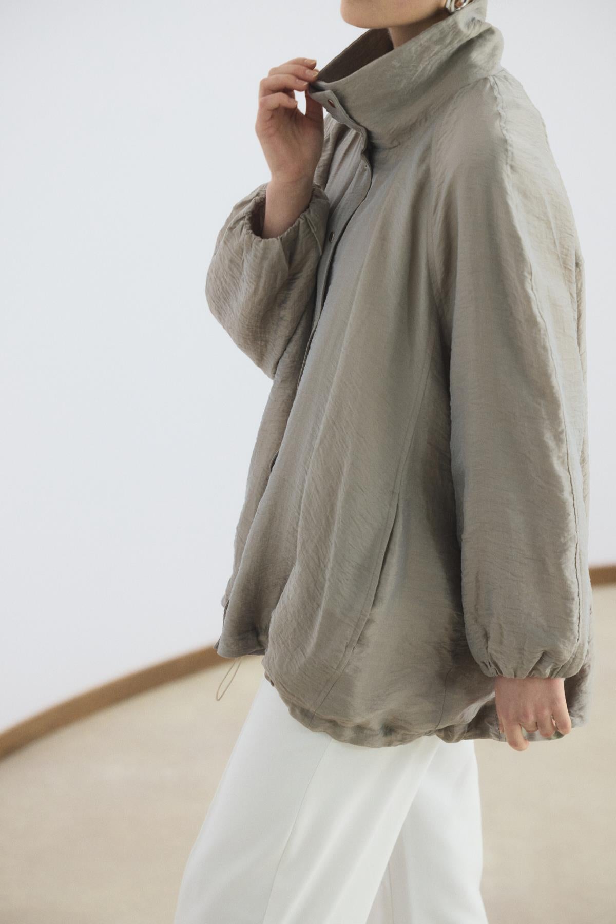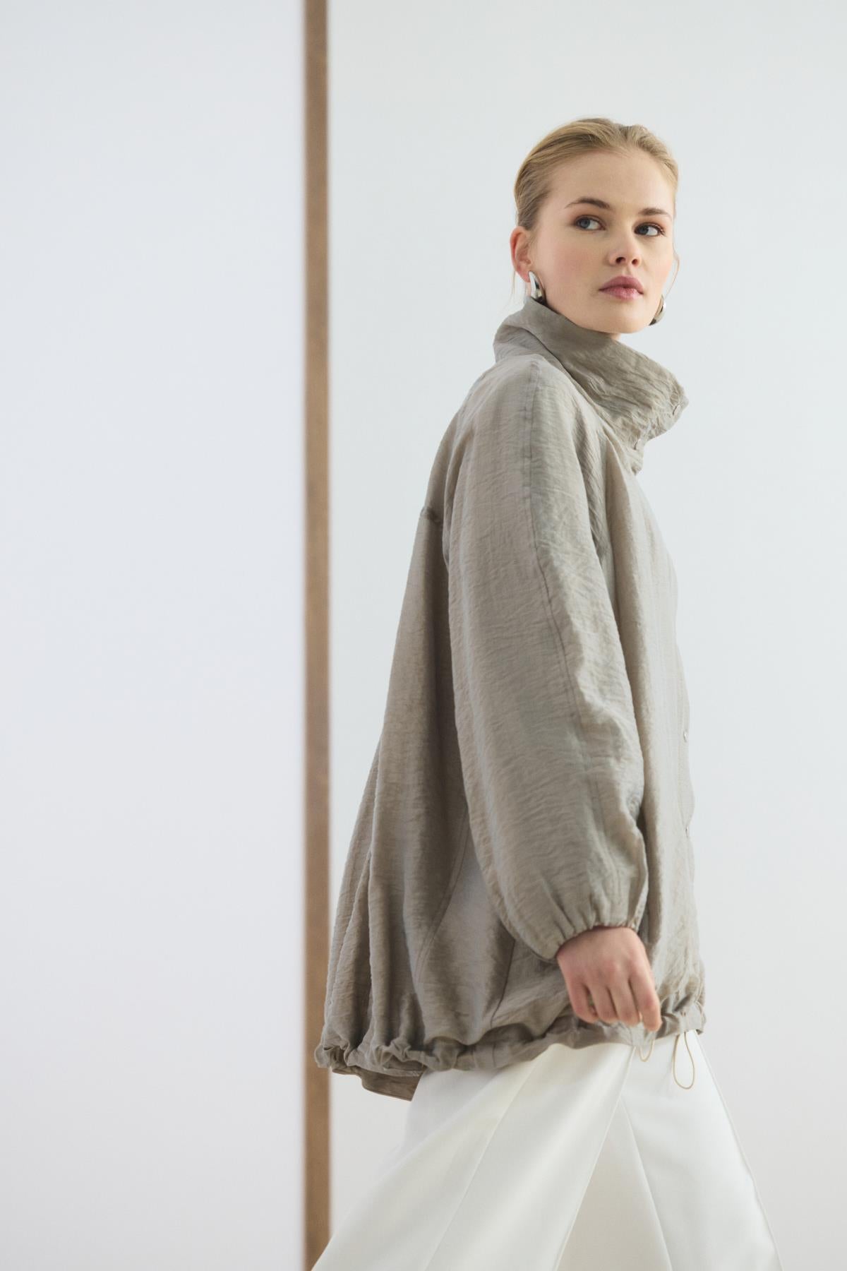ÜRÜN TANIMI Dik Yaka Büzgülü Bomber Ceket Vizon, viskon karışımlı teknik kumaşının pürüzsüz dokusuyla üstünüzde hafif bir his bırakır. Dik yaka tasarımı, reglan balon kolları ve aşağıya doğru genişleyen evaze formu, alışılmış ceket tasarımlarına modern bir yorum katar. Çıtçıtlı kapaması, gizli metal fermuarı ve iç astarı ile kullanım kalitesini artırırken, yan cepleriyle günlük pratiklik sunar.
