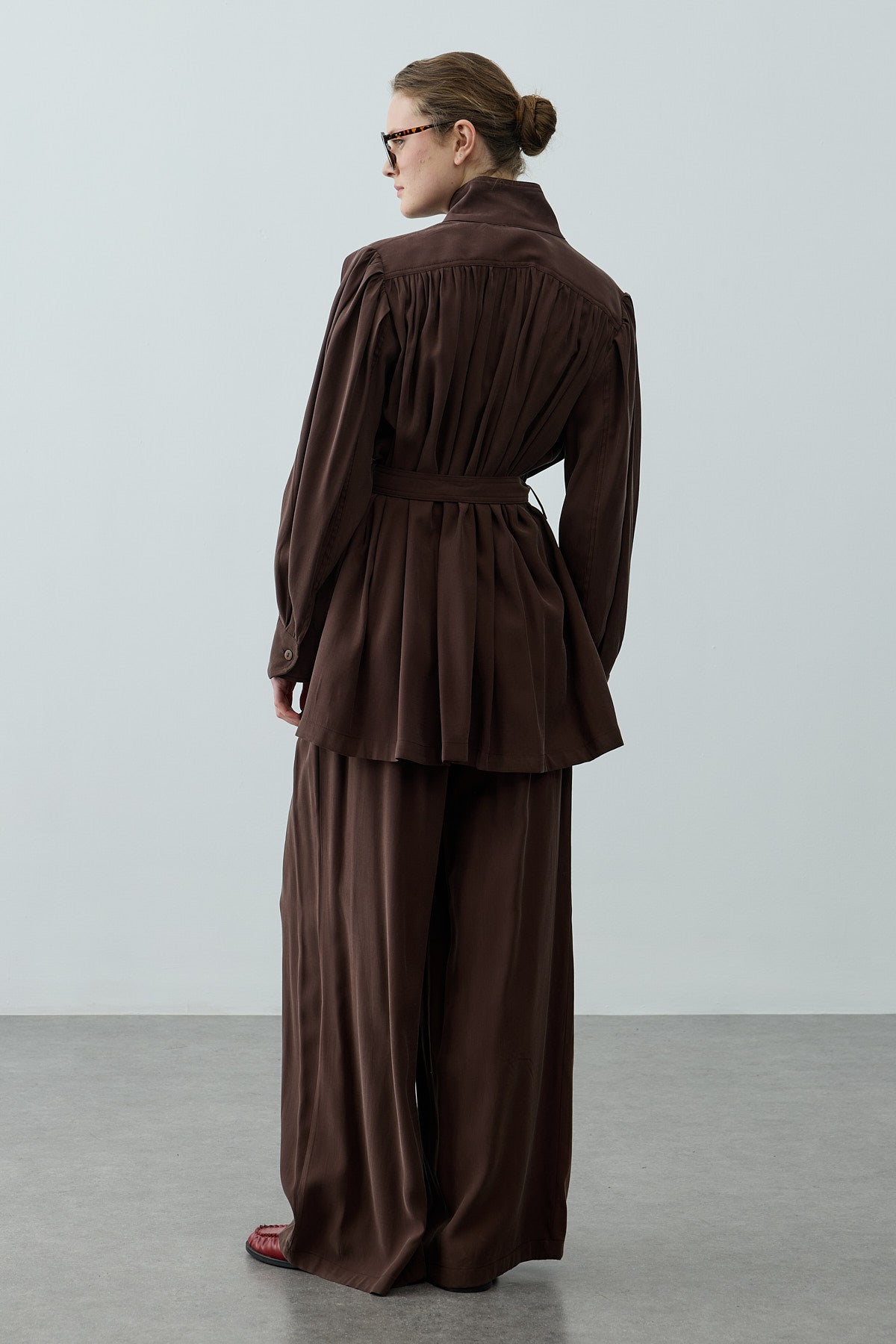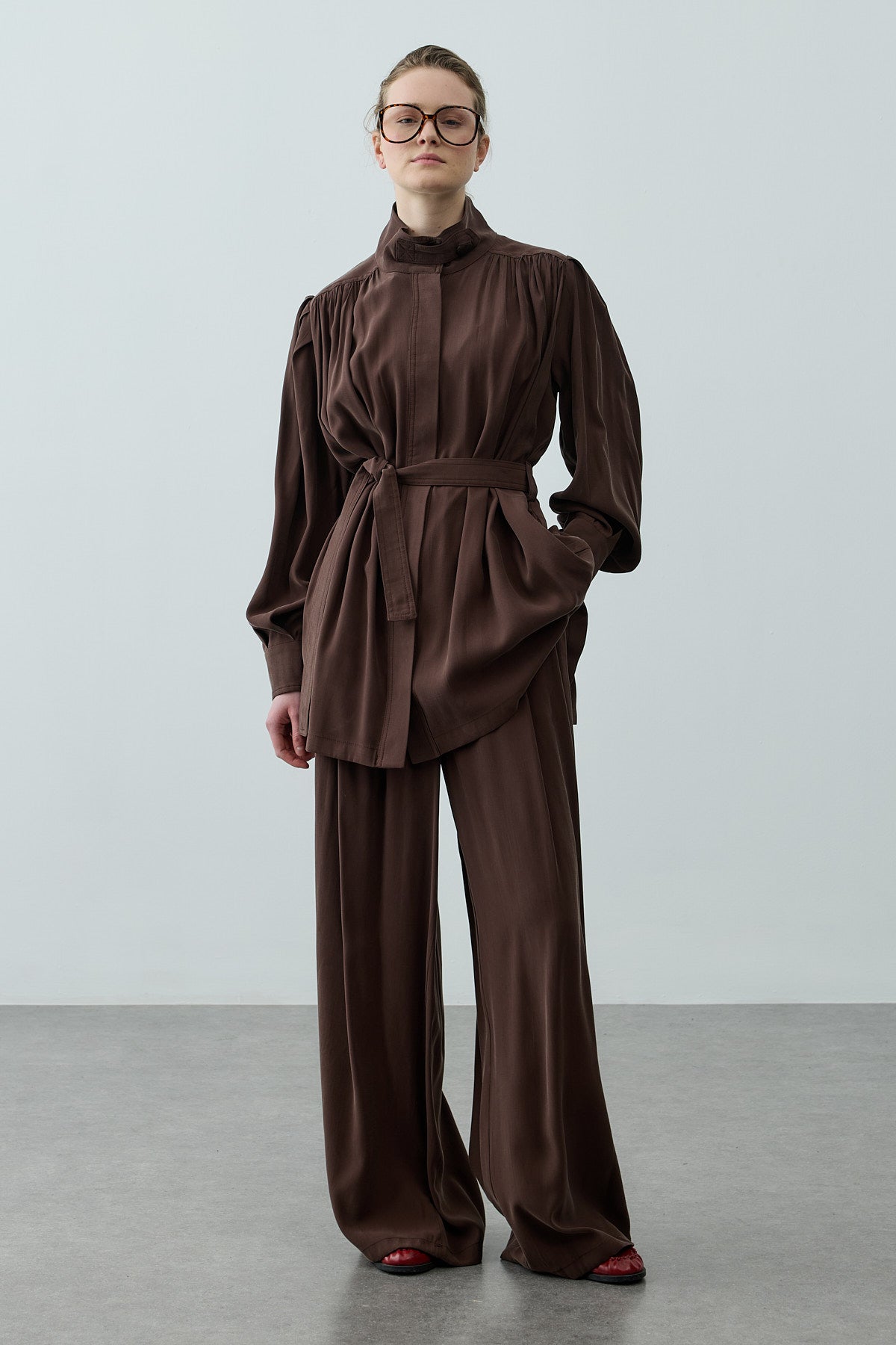Tensel dokuma kumaştan, dik yakalı, önü düğme kapamalı, uzun kollu, manşetli, seyyar kemerli, cepli gömlek ve fermuarlı, düğme kapamalı, pileli, palazzo kesim pantolon takım.