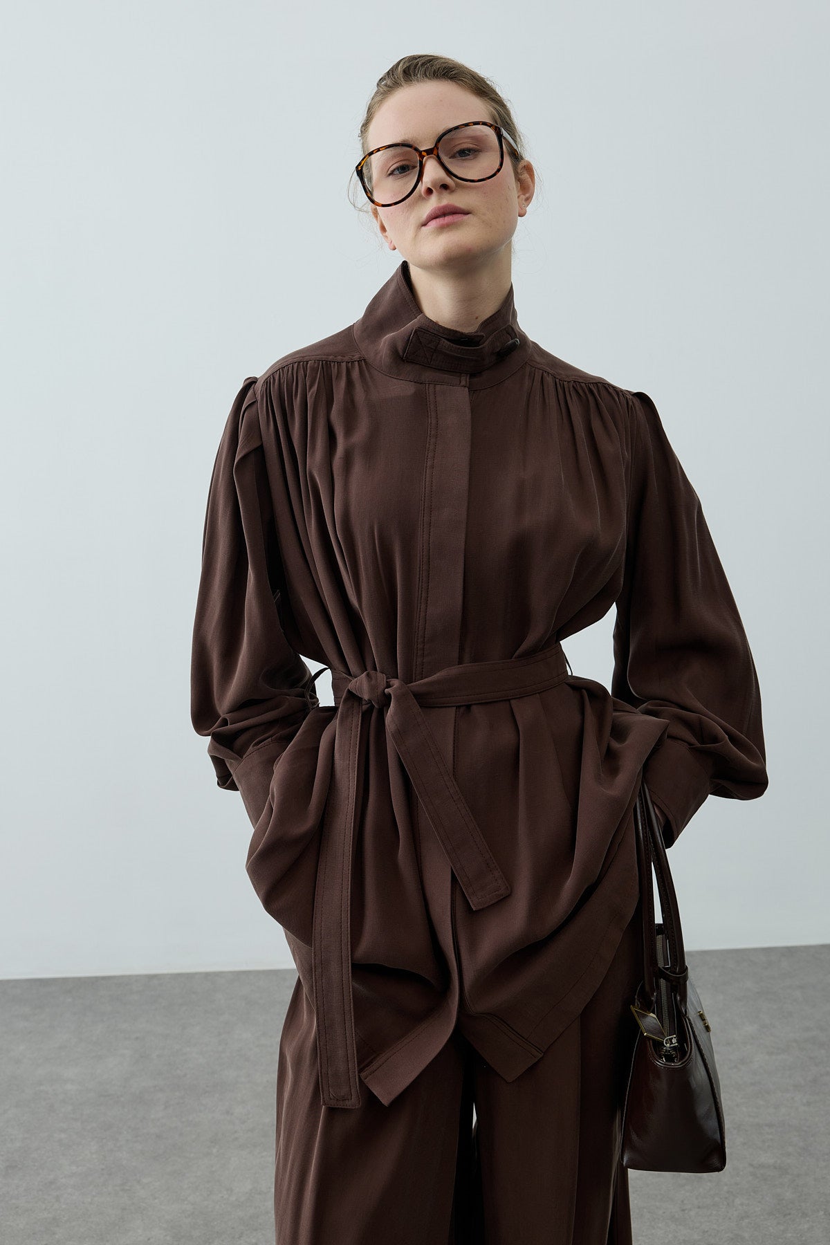 Dik Yaka Büzgülü Takım Kahverengi