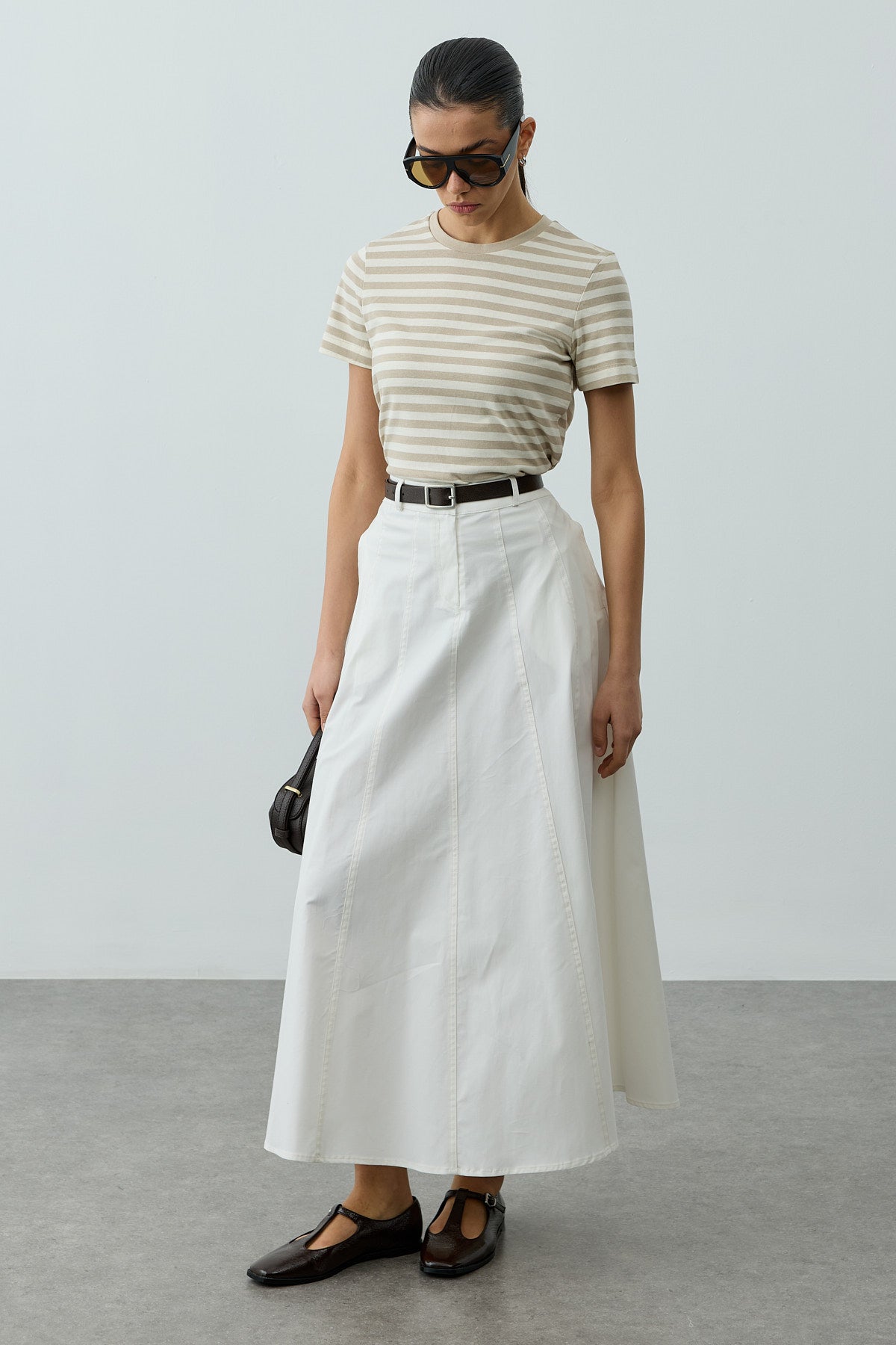 Beli lastikli, kemer köprülü, cepli, rahat kesim, normal kalıp, astarsız, pamuklu kumaştan üretilmiş poplin etek.
