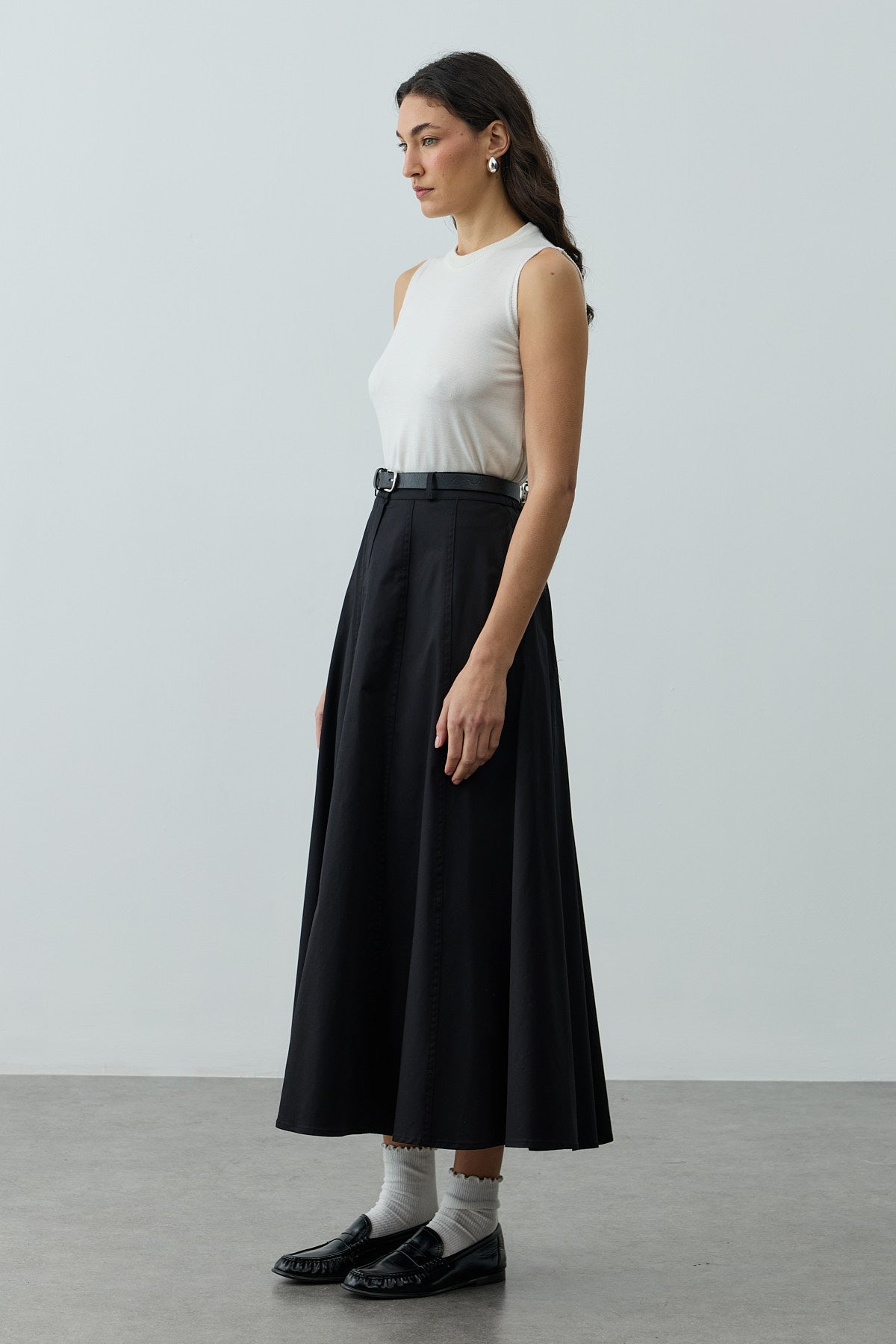 Gabardin dokuma kumaştan, önü düğme ve fermuar kapamalı, çift iğne dikişli parçalı maxi boy etek.