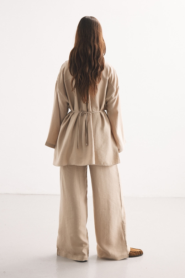 Tunik ve pantolonun uyumlu siluetiyle öne çıkan bu takım, aplike cep detaylarıyla sade tasarıma sofistike bir karakter kazandırır. Akıcı kumaşı gün boyu konfor sağlarken, modern çizgisi şehir stiline güçlü ama yalın bir dokunuş ekler.