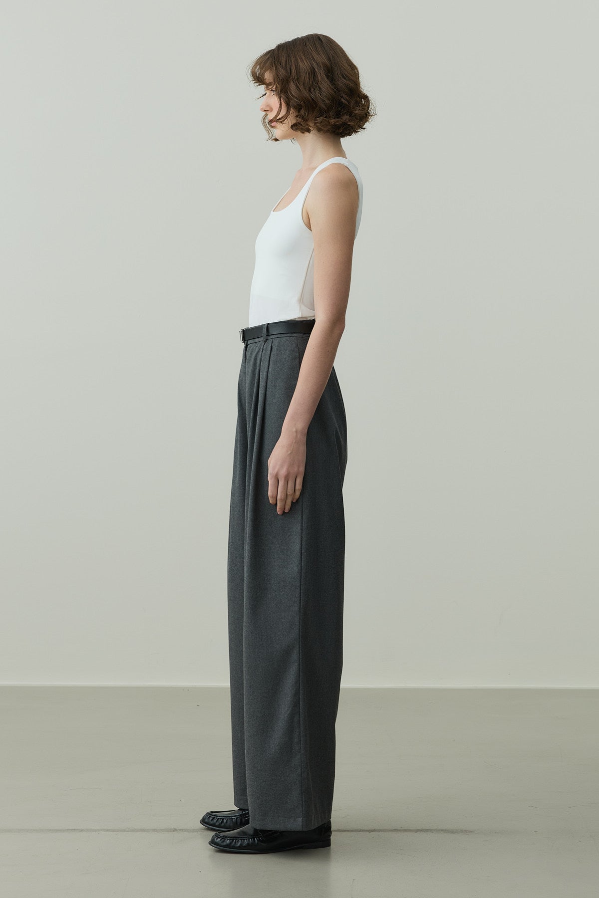 Dokuma kumaştan, yüksek bel, ön cepli, pileli, önü fermuar ve düğme kapamalı pantolon.
