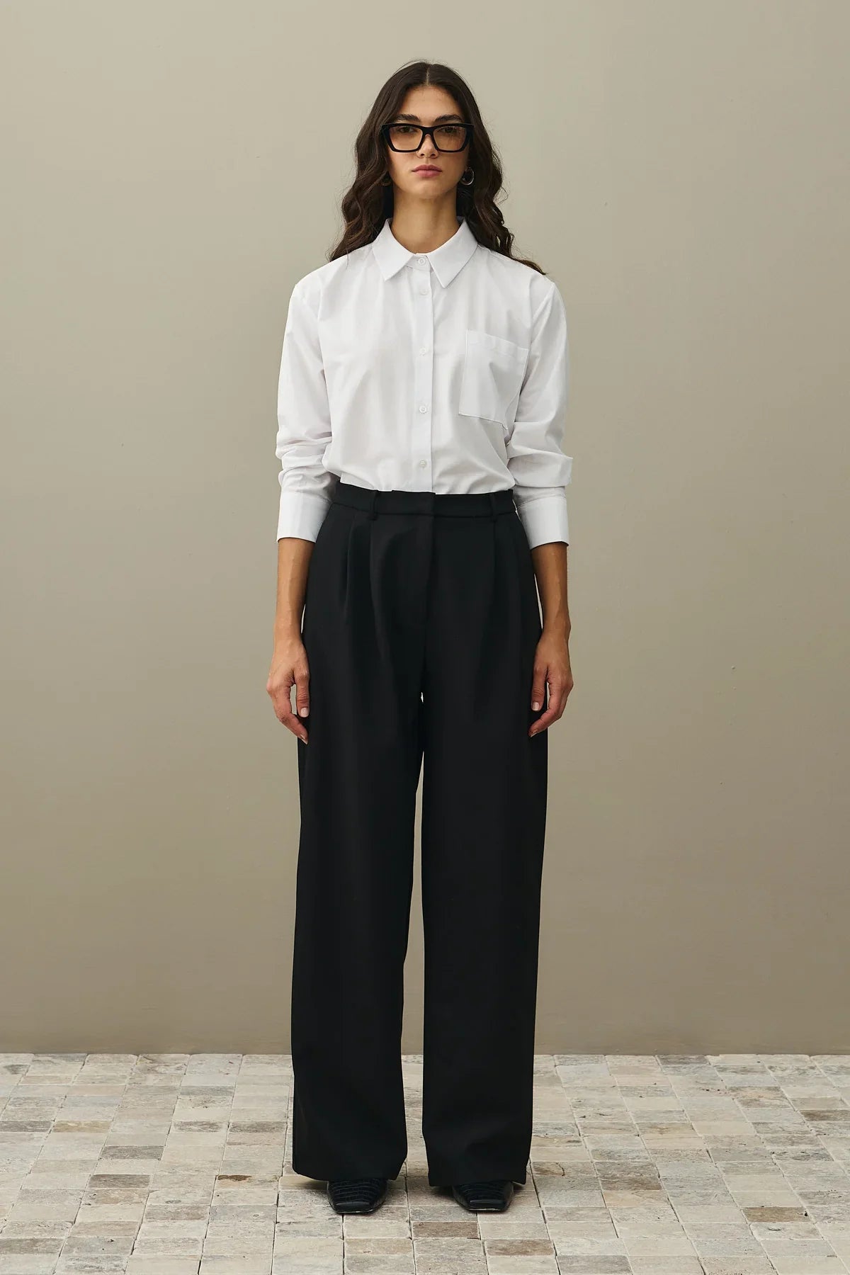 Dokuma kumaştan, yüksek bel, ön cepli, pileli, önü fermuar ve düğme kapamalı pantolon.