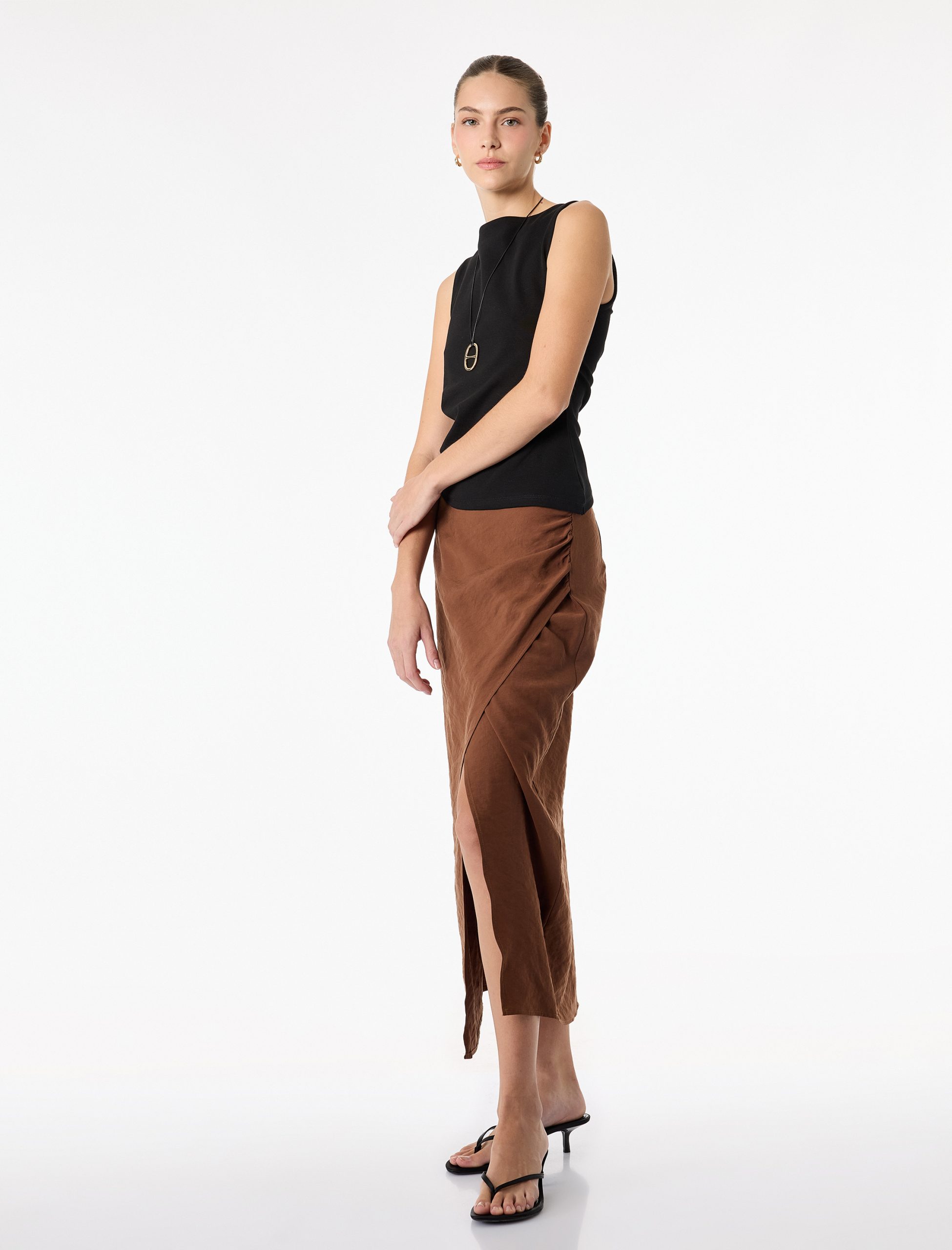 Drapeli Yırtmaç Detaylı Kruvaze Midi Etek